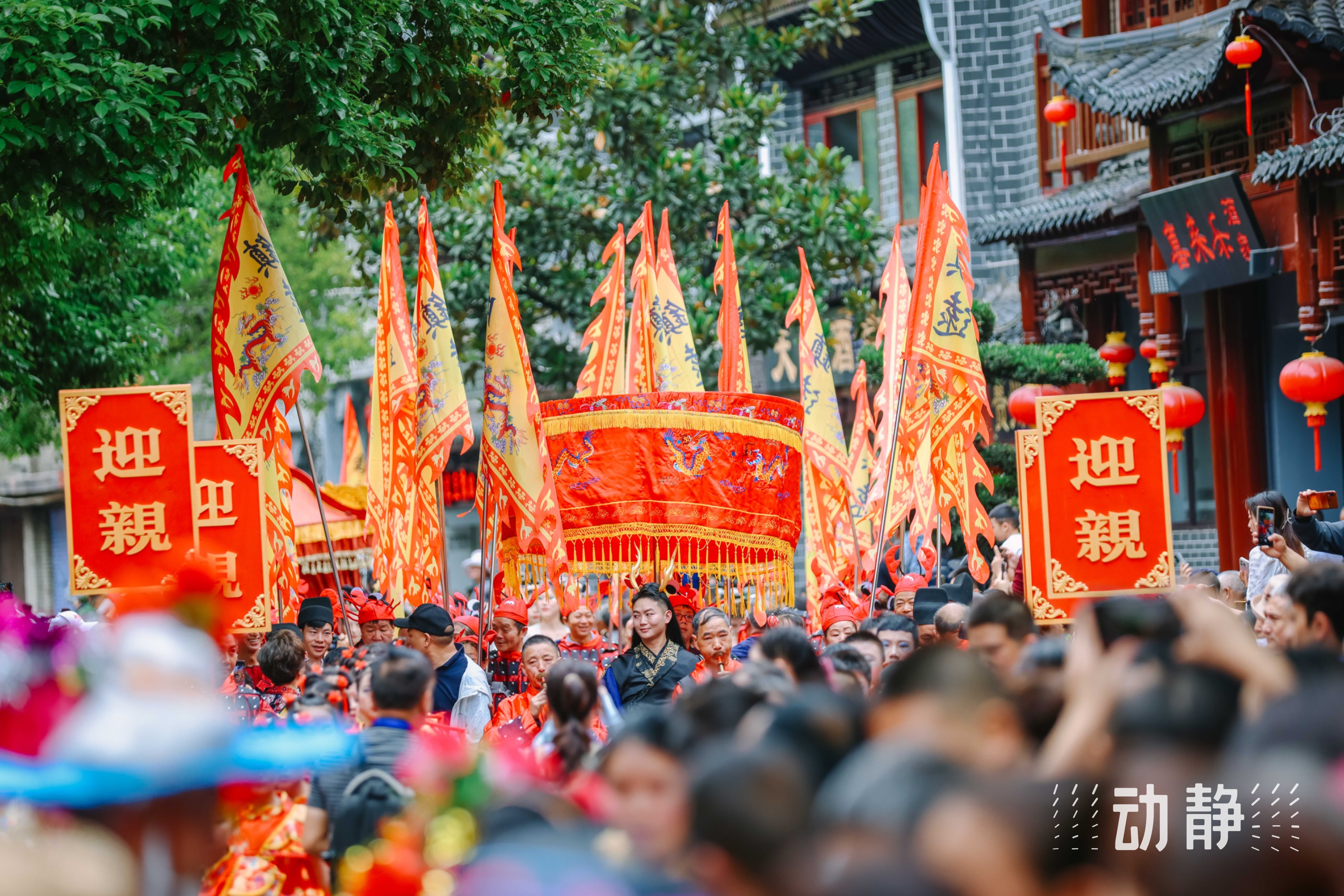 锣鼓喧天,以《儒林外史》第四十三回讲到的“龙神嫁妹”为故事蓝本,一场盛大的传统中式迎亲队伍正在走来。