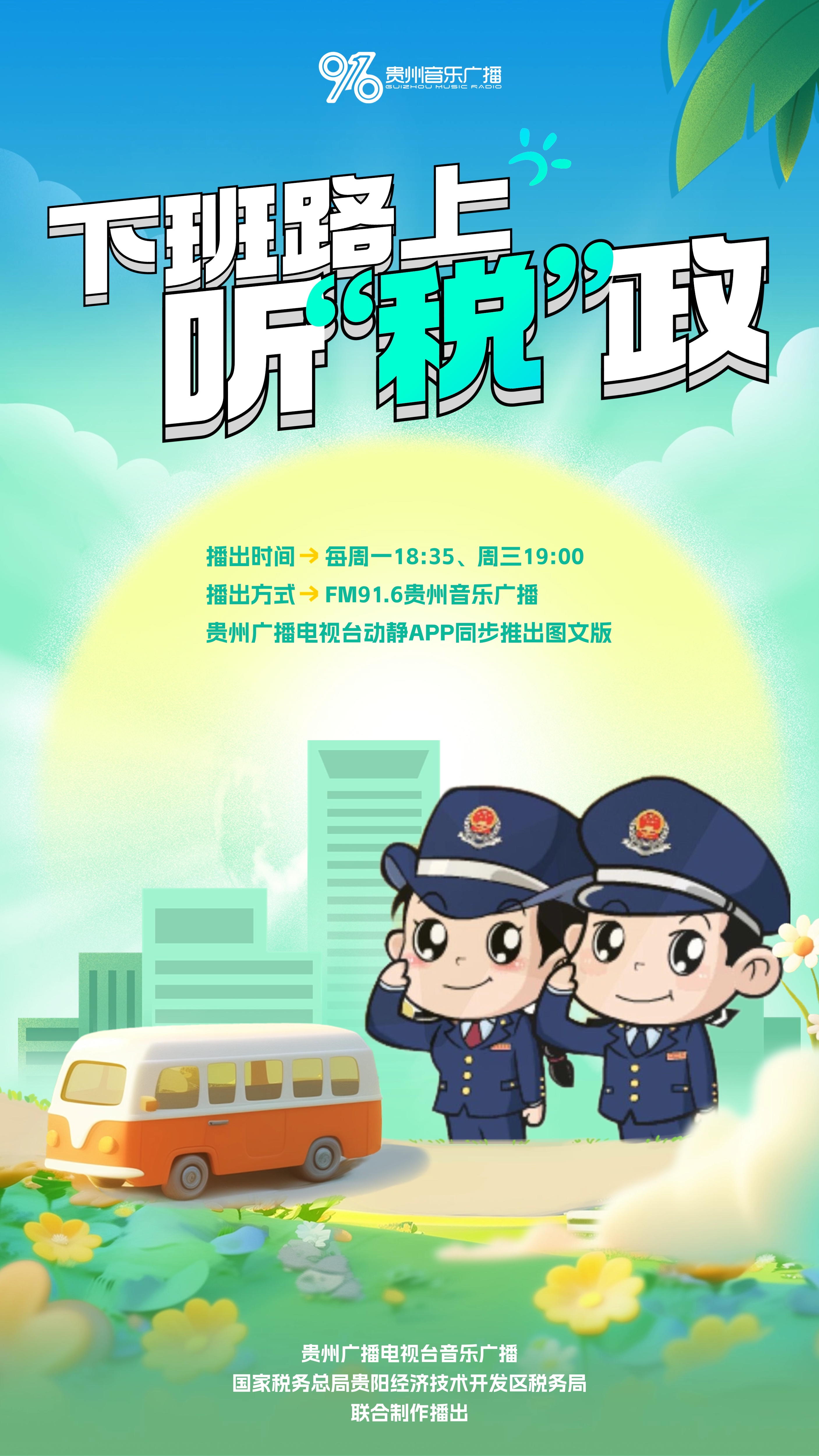 为提高税收普法的广泛性和有效性,进一步提升纳税人缴费人对最新税收优惠政策的知晓度,由国家税务总局贵阳经济技术开发区税务局和贵州广播电视台联合推出的广播情景短剧《下班路上听"税"政》将于6月17日起,每周一18:35分及每周三19:00点在FM91.6贵州音乐广播播出。该节目主要围绕税费优惠政策等纳税人缴费人关注的热点税费话题展开,以一问一答还原老百姓日常生活场景的形式普及税费政策,用全新的模式传递税务“好声音”“好故事”“好政策”。