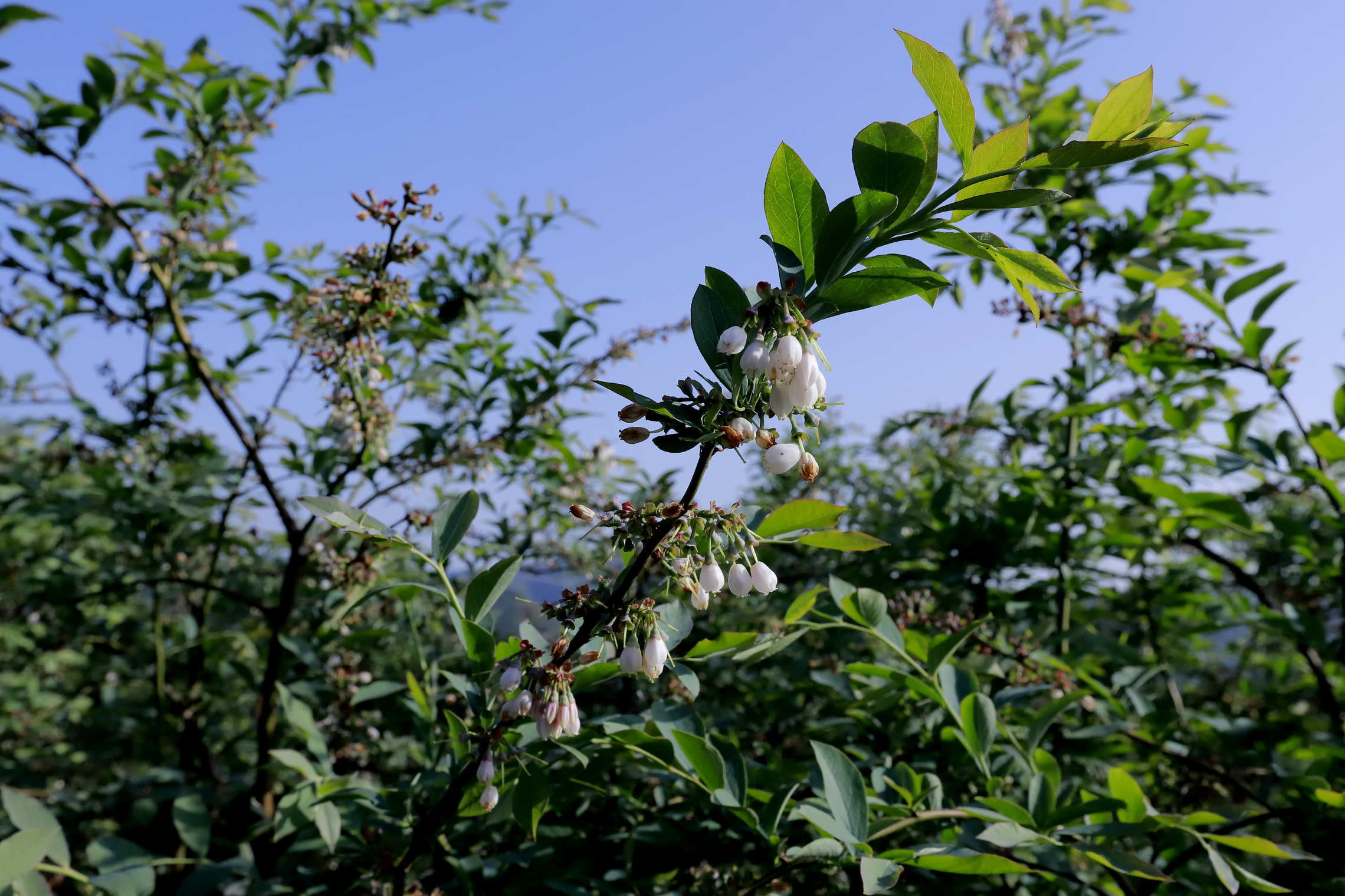 百闻不如一见,在吴支书的带领下,记者来到硐口村万亩蓝莓基地,放眼望去,一片春意盎然,如白玉灯笼般的蓝莓花竞相绽放。