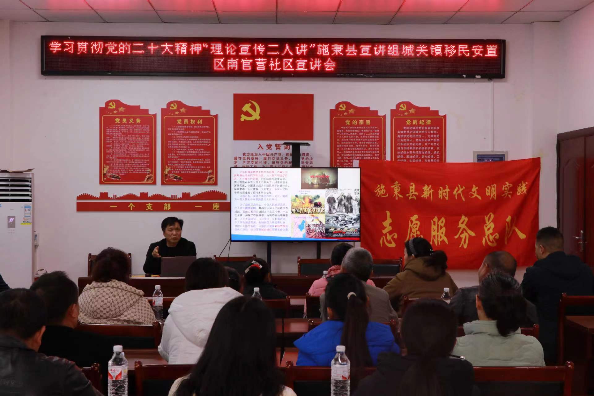 在城关镇南官营社区,施秉县委党校宣讲员与同组宣讲成员施秉县邮政公司退休员工、全国劳动模范朱正琴同志共同为群众开展宣讲。宣讲教师以《牢牢把握新时代中国特色社会主义思想的世界观和方法论》为题,结合党的二十大精神,为大家讲解了党的二十大精神理论知识。朱正琴同志为大家讲解了自己18年来从事乡邮,风餐露宿、一直奔跑在为人民服务路上事迹,宣讲得到了群众的热烈掌声,现场气氛十分热烈。