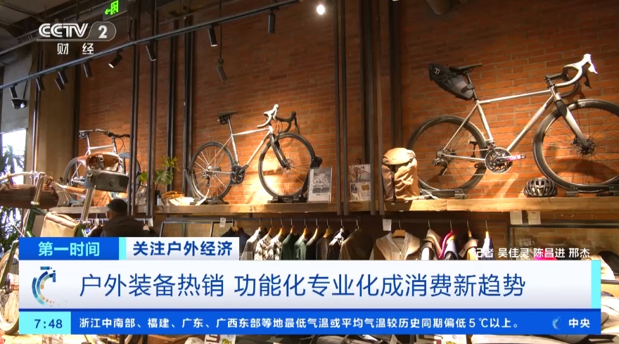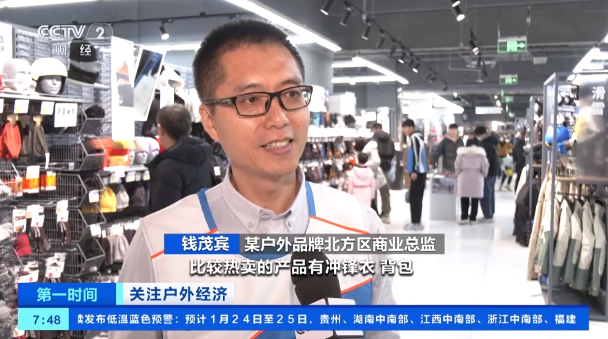 某户外品牌北方区商业总监 钱茂宾:比较热卖的有冲锋衣、背包、登山杖、山地徒步鞋系列产品、单板滑雪类产品,还有公路自行车系列产品。
