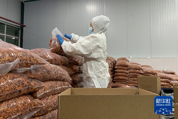 图为一名工人正在打包脱水南瓜条。(受访者供图)