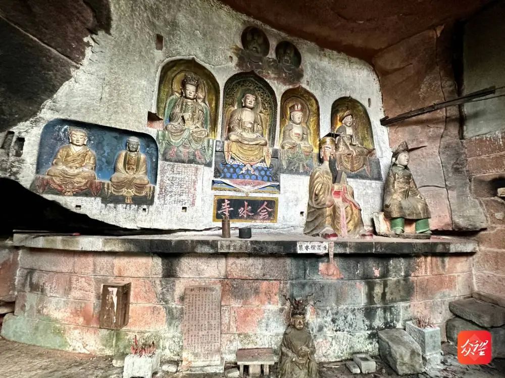 贵州赤水,两河口镇。小镇有个名叫“老虎嘴”的山崖。沿山逐级而上,在离河面96米的平台上,是开凿于清乾隆年间,距今282年的三会水石窟寺。