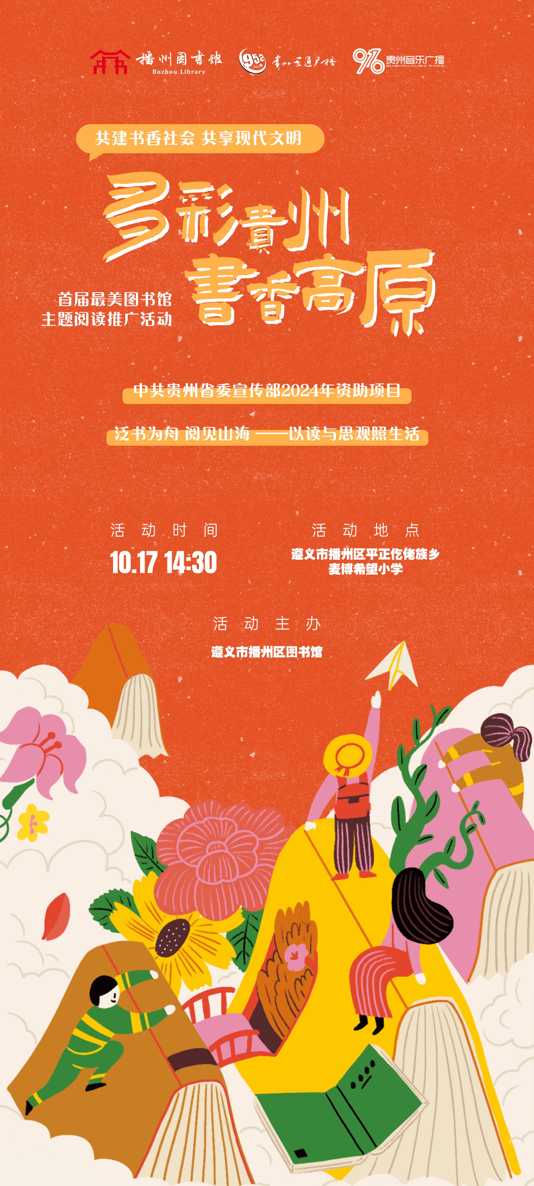 泛书为舟,阅见山海。10月17日遵义市播州区图书馆走进平正仡佬族乡麦博希望小学,开展“多彩贵州·书香高原”首届最美图书馆阅读推广系列活动,此系列活动旨在发挥最美图书馆的引领带动作用,积极推广全民阅读“共建书香社会,共享现代文明”。活动现场,播州区图书馆开着“流动图书车”走进学校,让孩子们接触到更多书籍,拥有一段纯粹的阅读时间。同时进行了主题阅读分享、书籍捐赠、结对共读等活动。