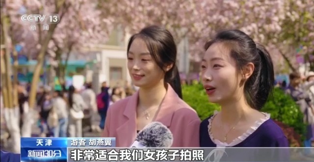 游客 胡燕翼:今天天气非常好,这个海棠花又是粉嫩粉嫩的,非常适合我们女孩子拍照,我们刚拍了特多照片,可好看了。