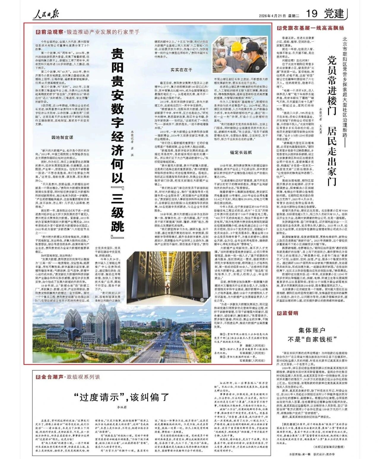 4月21日,《人民日报》以《贵阳贵安数字经济何以“三级跳”》为题,报道贵安贵安数字经济从无到有、从存到算、从算到用“三级跳”。这背后离不开当地党员干部树立和践行正确政绩观,因地制宜、真抓实干的坚实支撑。正文如下: