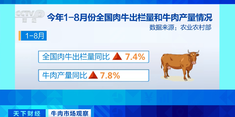 根据农业农村部监测,今年1-8月全国肉牛出栏量同比增长7.4%,牛肉产量同比增长7.8%。其中,8月份全国肉牛出栏量环比增长1.9%,同比增长4.9%。