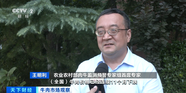农业农村部肉牛监测预警专家组首席专家 王明利:全国牛肉价格已经连续11个月下跌,目前牛肉价格每公斤超68元,跌至近5年来最低,现在活牛价格每公斤超23元,跌至近10年来的最低水平。