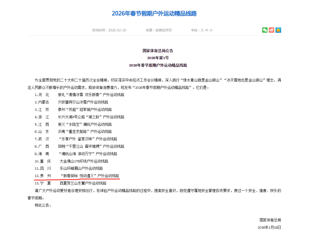 2月10日,国家体育总局发布“2026年春节假期户外运动精品线路”,贵州省“新春探秘 悦动遵义”户外运动线路入选。