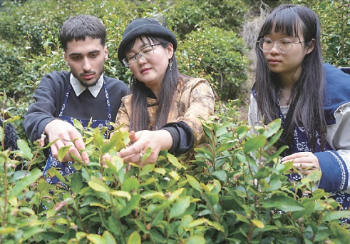 日前,浙江省湖州市长兴县水口乡顾渚村文化特派员王娜(中)带领湖州师范大学研究生、留学生走进顾渚村,在文化特派员的指导下,中外学生们体验采茶、制茶、品茶等传统技艺,学习当地茶文化与茶俗知识,沉浸式体验传统茶事,全方位感受中国茶文化的魅力。陈海伟 摄(来源:大国三农)
