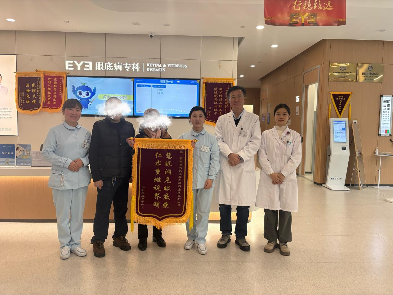1周后,医疗团队为唐叔叔的右眼施行了后入路玻璃体切割术、白内障超声乳化晶体抽吸、散光矫正型双焦点人工晶状体植入术。手术在高清广角镜下由蔡善君完成。术后唐叔叔的右眼视力明显提升,左眼视力得到稳定,唐叔叔及家属专门定制锦旗感谢医护团队。