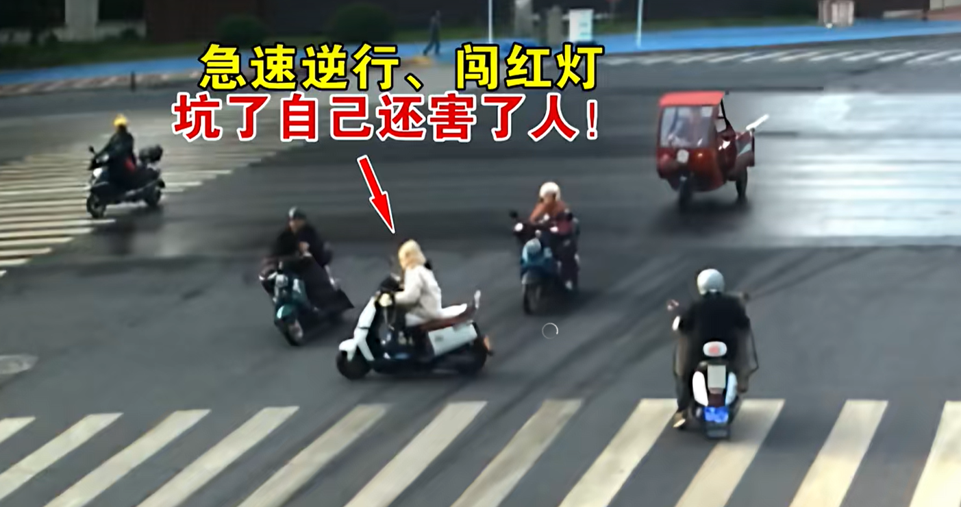 2026年3月8日,江西丰城。朱某驾驶电动自行车逆行来到路口,无视红灯、无视相交方向上的车辆,毫不减速疾冲而过,结果与另一辆绿灯直行的电动自行车相撞,致对方骑车人摔倒在地。万幸未造成严重后果。