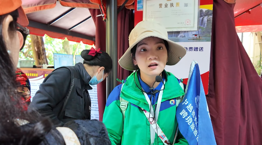 正在向越南游客讲解德天瀑布的中国导游李菲菲