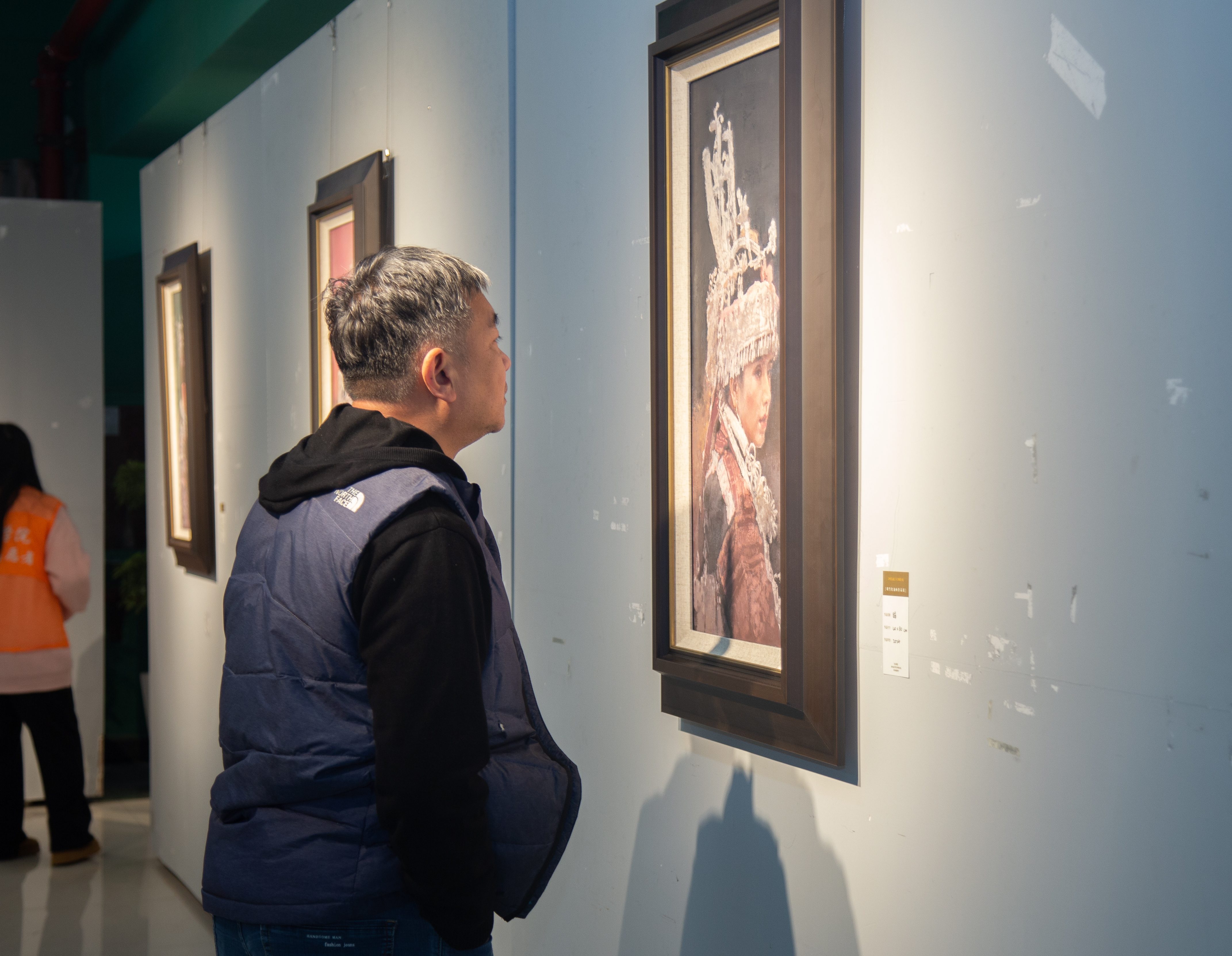 本次展览展出了胡雪松老师约40件作品,题材包含人物和风景。其中,以苗族人物服饰形象为核心意象的油画作品尤为吸引观众,艺术家通过厚重的油彩堆叠、刮刀刮擦的肌理,让银冠、银项圈的冷硬与绵密在画布上同时浮现,既保留了银饰本身作为民族财富符号的分量感,又通过绘画语言的“书写感”,消解了符号的距离感。中国美术家协会理事,贵州省美术家协会主席团成员、副秘书长晏明说:“这是用当代绘画语言对古老民族文化进行的诗意转译,它既不是对民俗符号的简单复刻,也不是脱离文化根系的形式实验,而是在‘质感’与‘情感’的双重锚点上,搭建起传统与现代的审美桥梁。”