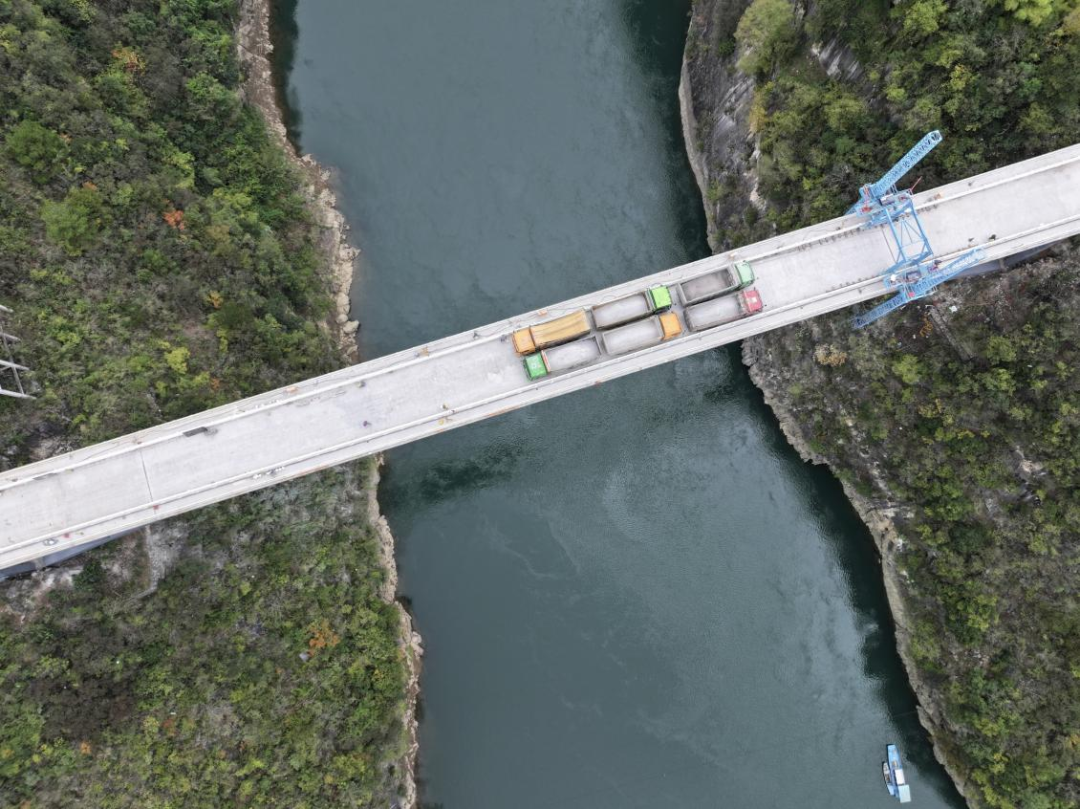 为期3天的荷载试验中,检测团队采用静载与动载相结合的检测方式,并引入BIM数字建模与环境参数修正技术,实时监测桥梁在不同工况下的响应数据。静载试验中,6辆载重40吨的试验车辆按预定工位依次上桥,模拟重载通行状态;数百个高精度传感器同步监测主拱、上弦杆、墩台等关键部位的应变与位移情况。动载试验则通过跑车、刹车等多种工况,测试桥梁的动力特性。