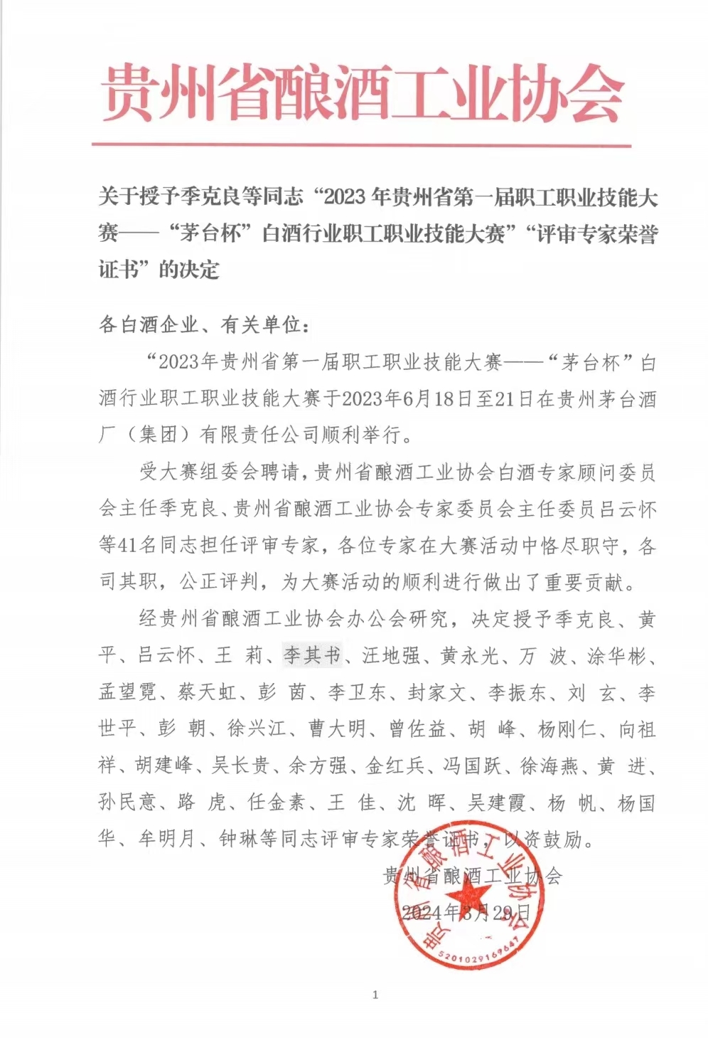会议还对在2023年贵州省职工职业技能大赛“茅台杯”中,为评审工作作出重要贡献的专家们颁发荣誉,授予季克良、黄平、吕云怀、王莉等41位专家评审专家荣誉证书。