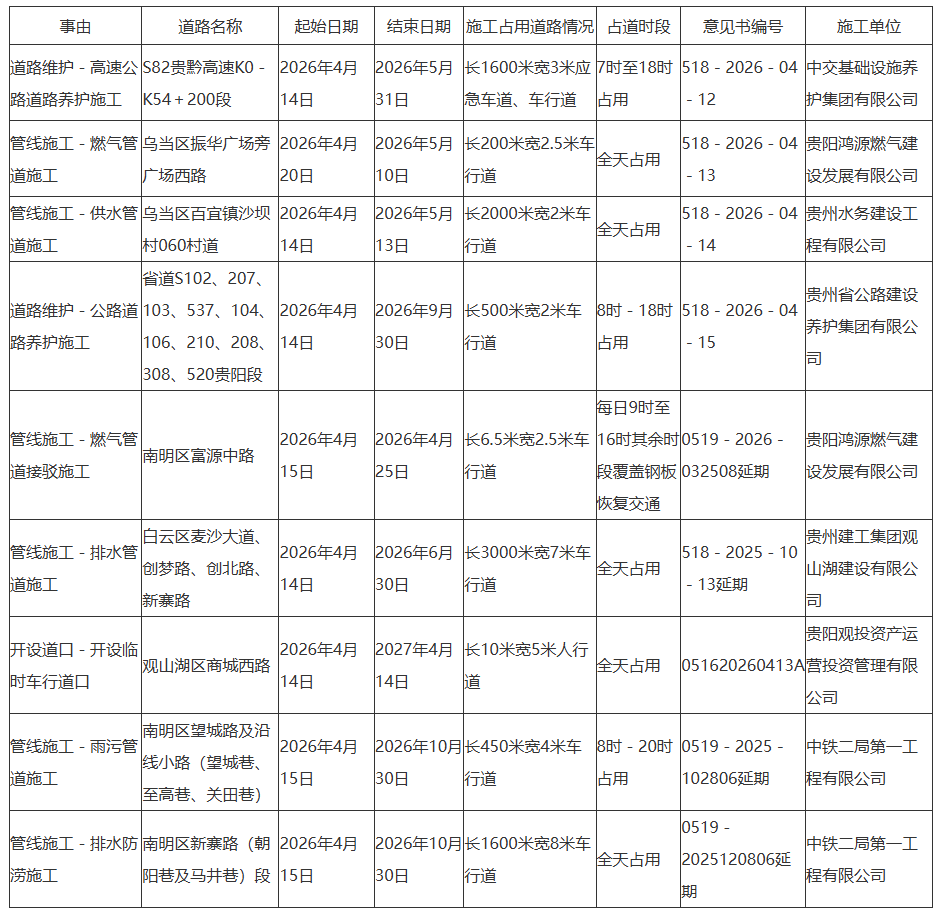 贵阳市南明区富源中路等近期临时占用道路施工提示