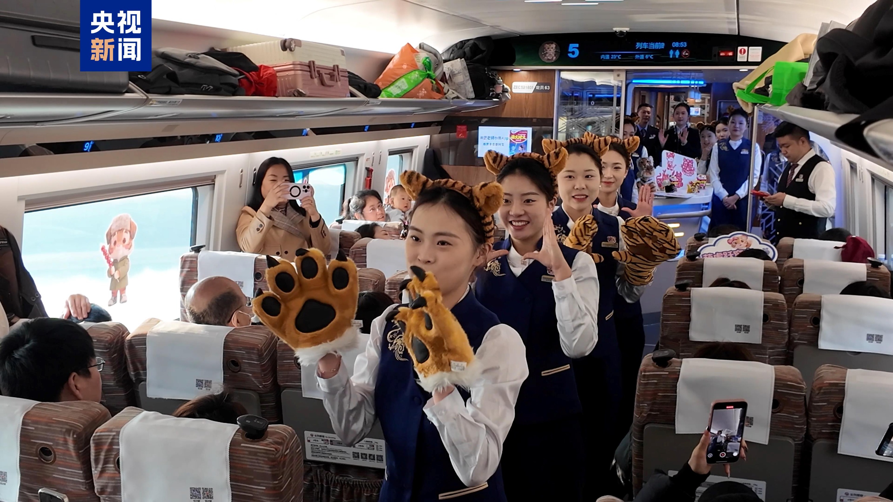 8时34分,G902次“萌虎”主题列车从哈尔滨西站驶出,开往北京。“萌虎列车”创意源自国家一级保护动物东北虎,设计了“京京”“哈哈”等系列卡通形象。列车对车窗、镜面、行李架、餐车吧台等旅客高频接触区域进行了整体主题营造,构建移动的沉浸式体验空间。