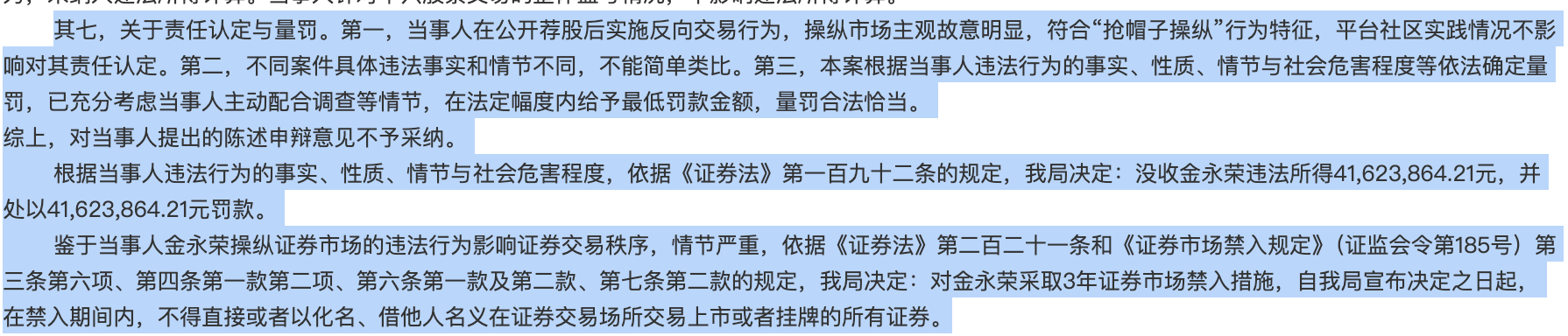 综合全案事实,浙江证监局作出最终认定:金永荣公开荐股后实施反向交易,操纵市场主观故意明显,完全符合“抢帽子操纵”行为特征;本案量罚已充分考量当事人主动配合调查等情节,系在法定幅度内处以最低罚款金额,量罚合法恰当。