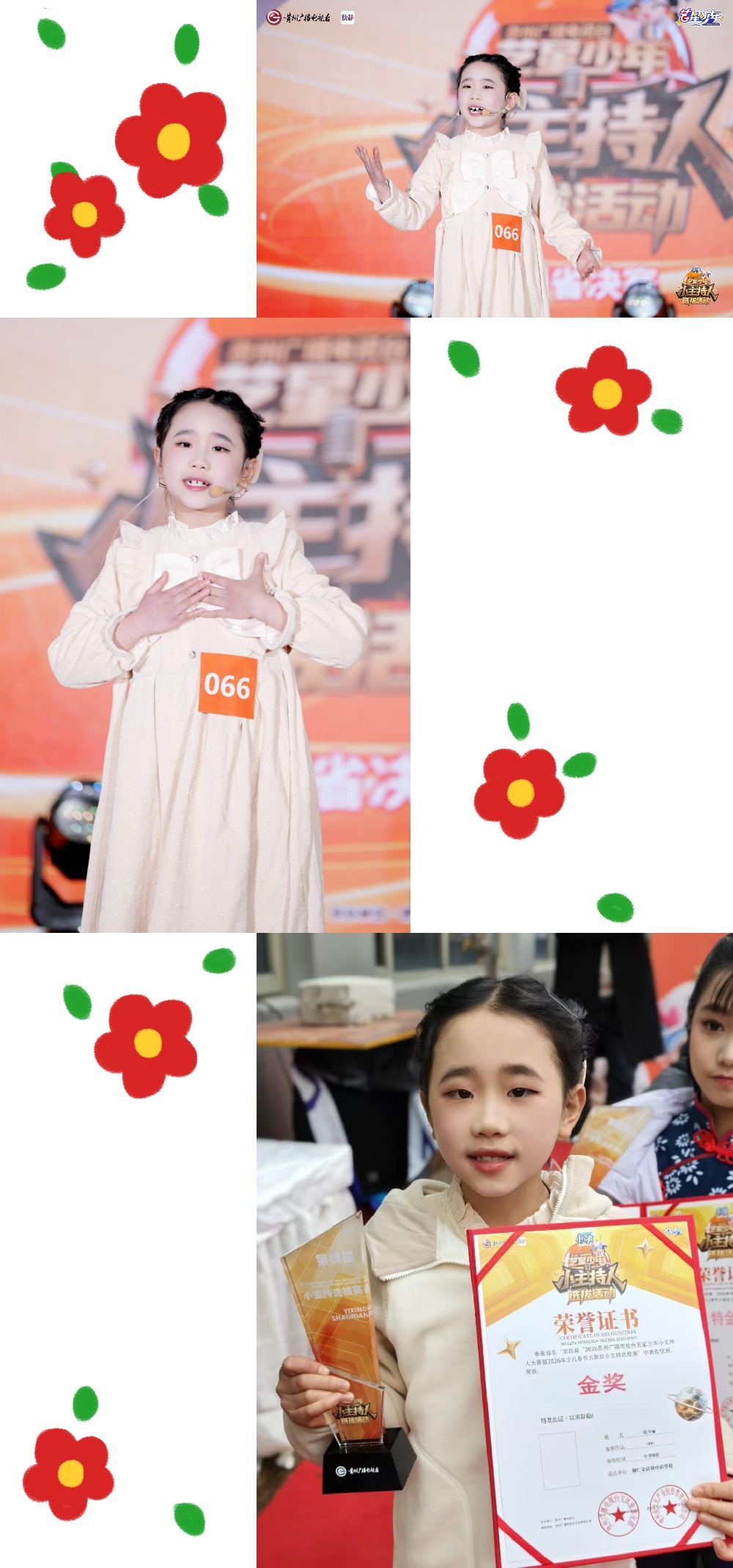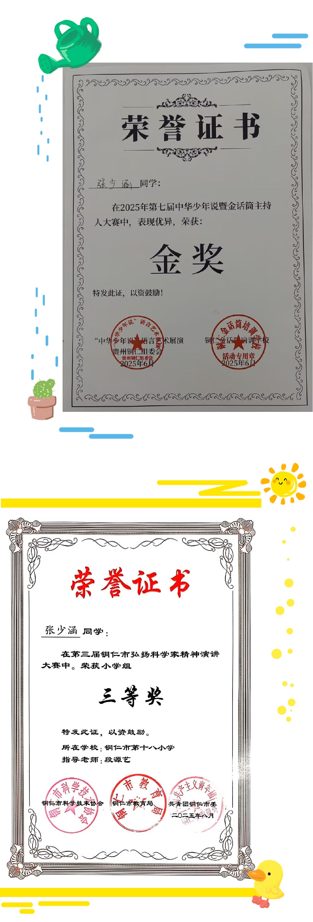 2025年,对我来说是充满成长与收获的一年:6月8日,在第七届中华少年说暨金话筒主持人大赛中,我获得了金奖;8月4日,我去北京参加了全国青少年“少年中国说”演讲比赛,很幸运地拿到了特金奖;11月30日,在铜仁市艺星少年演讲比赛中,我也获得了特金奖;12月21日,在贵州电视台举办的演讲比赛中,我收获了金奖;此外,我还在第三届铜仁市弘扬科学精神演讲比赛中获得三等奖。