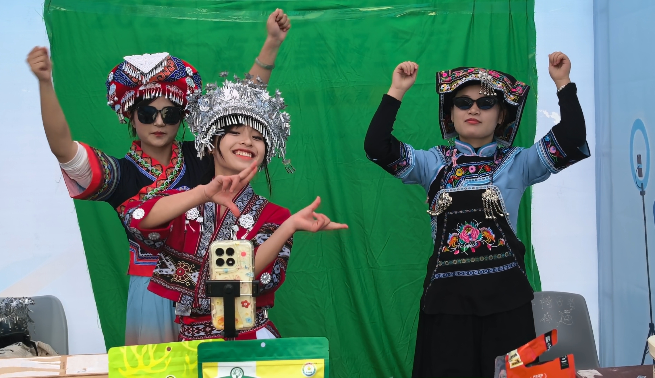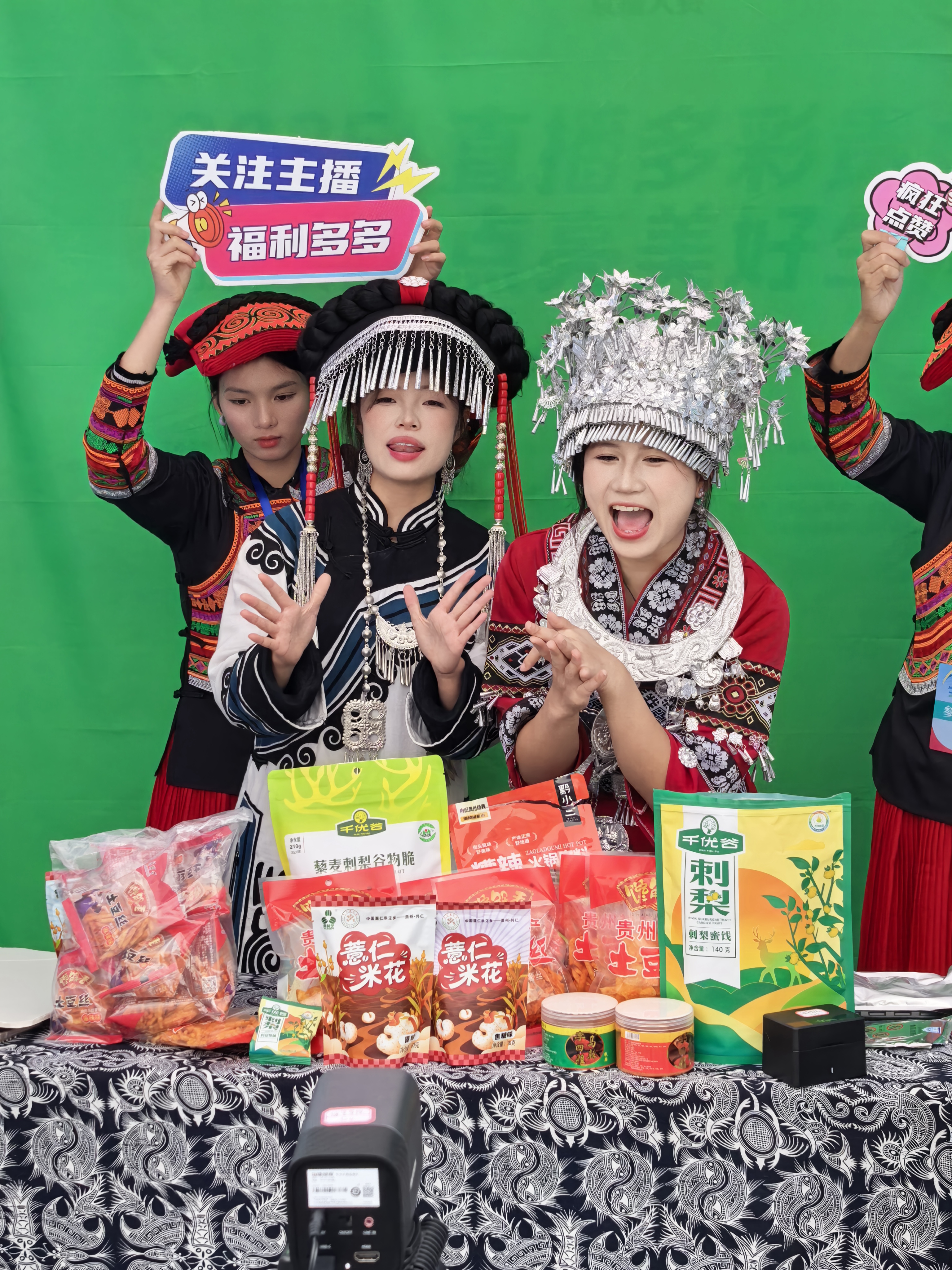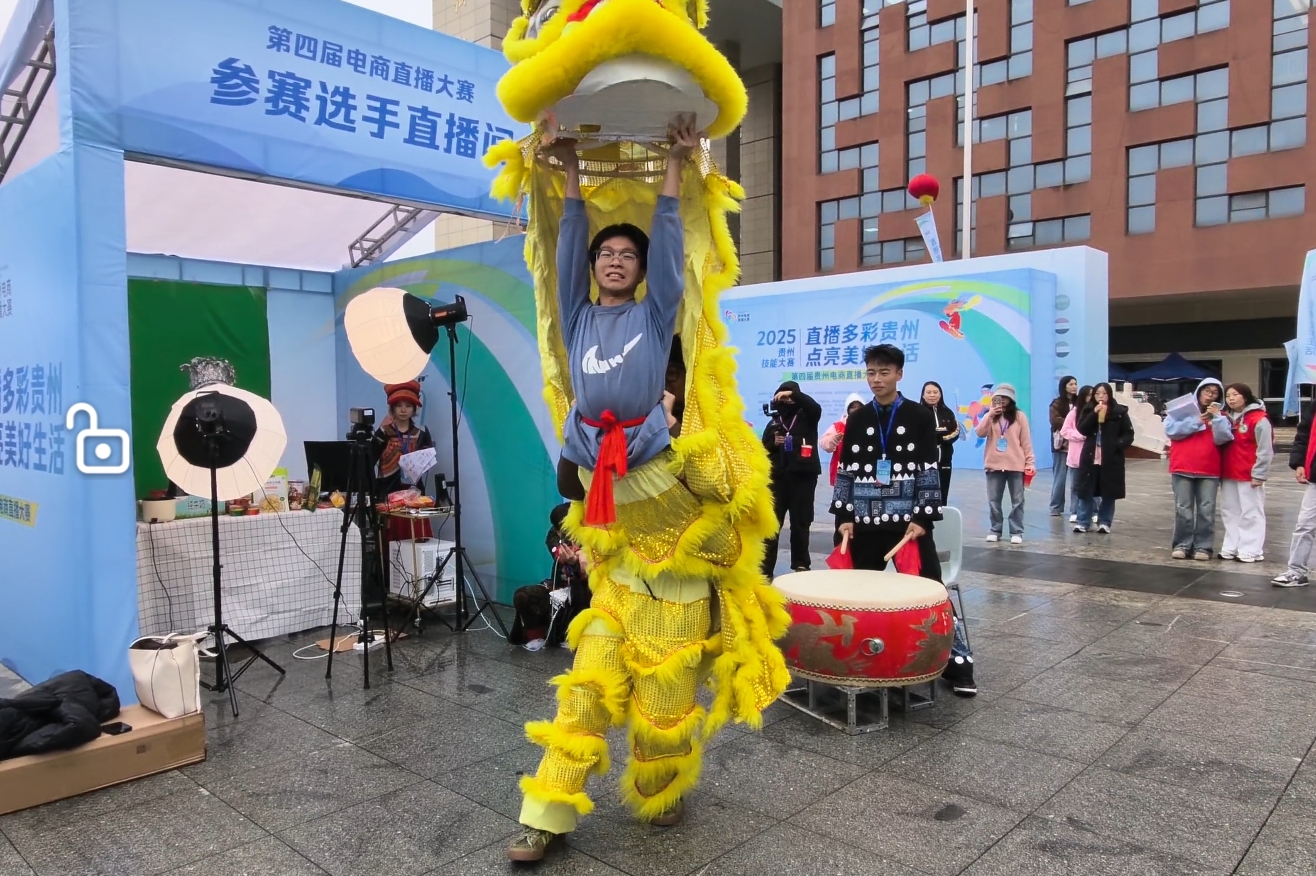 现场气氛热烈,声浪不断。为展现最佳状态,许多学生团队精心准备,有的身穿民族服装,有的搭配特色配饰,将贵州丰富的民族文化元素融入直播开场与产品推介中。有的团队在直播间隙跳起民族舞,动作整齐、节奏欢快;还有的团队搬出舞狮道具,锣鼓声中腾挪跳跃,为直播间聚人气、造氛围,现场热闹非凡。