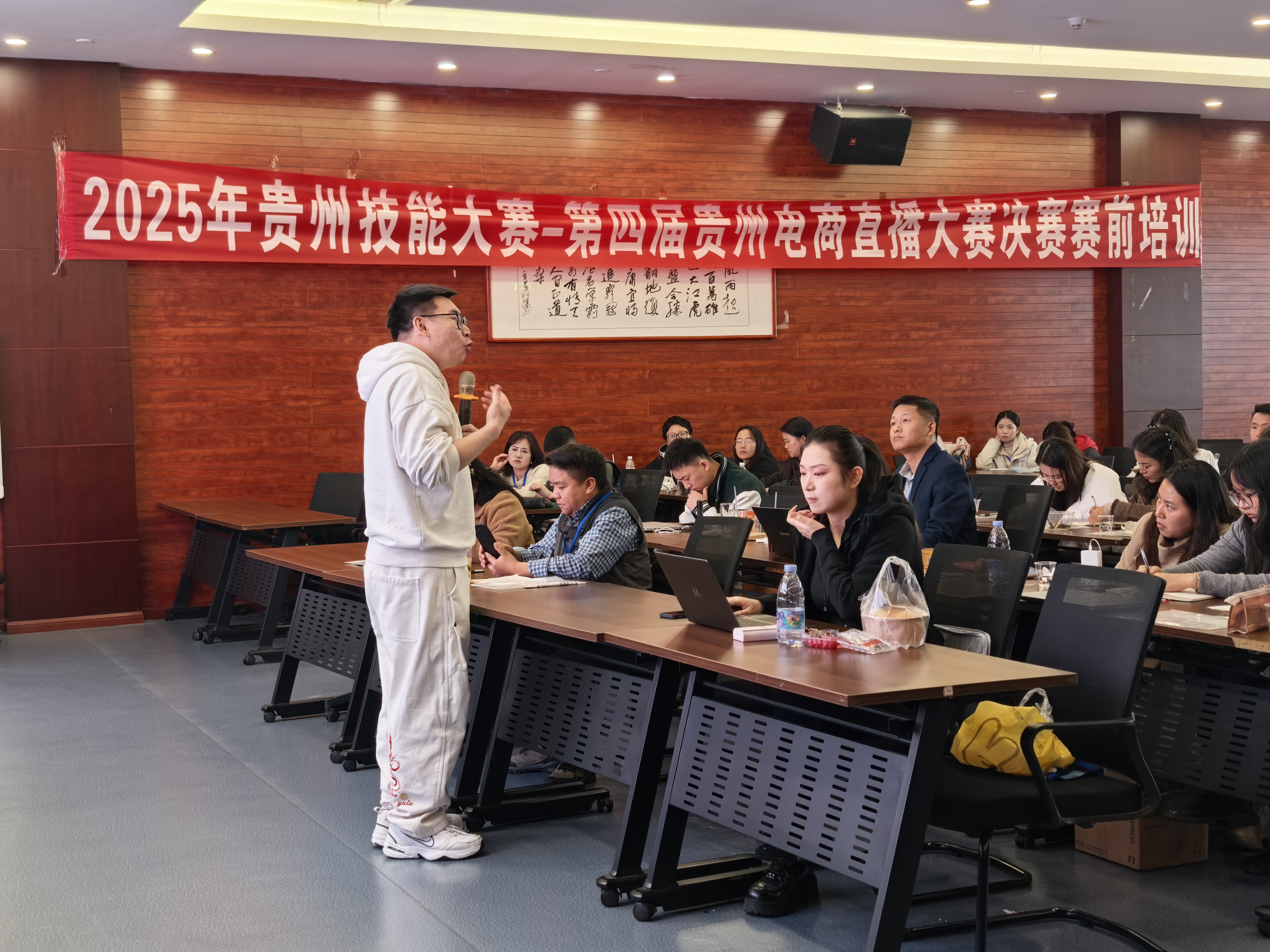 社会赛道与贵州白酒赛道选手全天参加集中培训。上午课程围绕直播场景搭建、设备调试与主播表达技巧展开,系统强化实战能力。下午,由中国国际电子商务中心认证讲师、千万红人操盘手张泽坤开展“讲师带练实操”环节,通过模拟直播、话术打磨和现场点评,帮助团队优化流程、提升表现。不少团队在指导后立即复盘,反复调整脚本,备赛氛围紧张而专注。