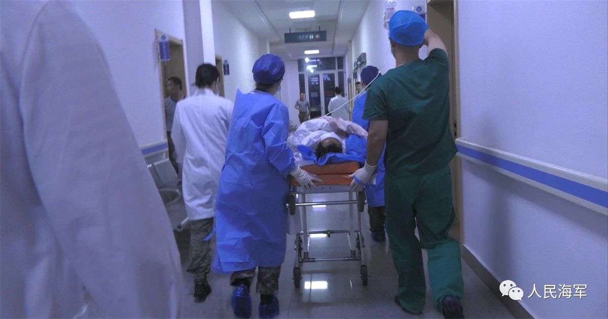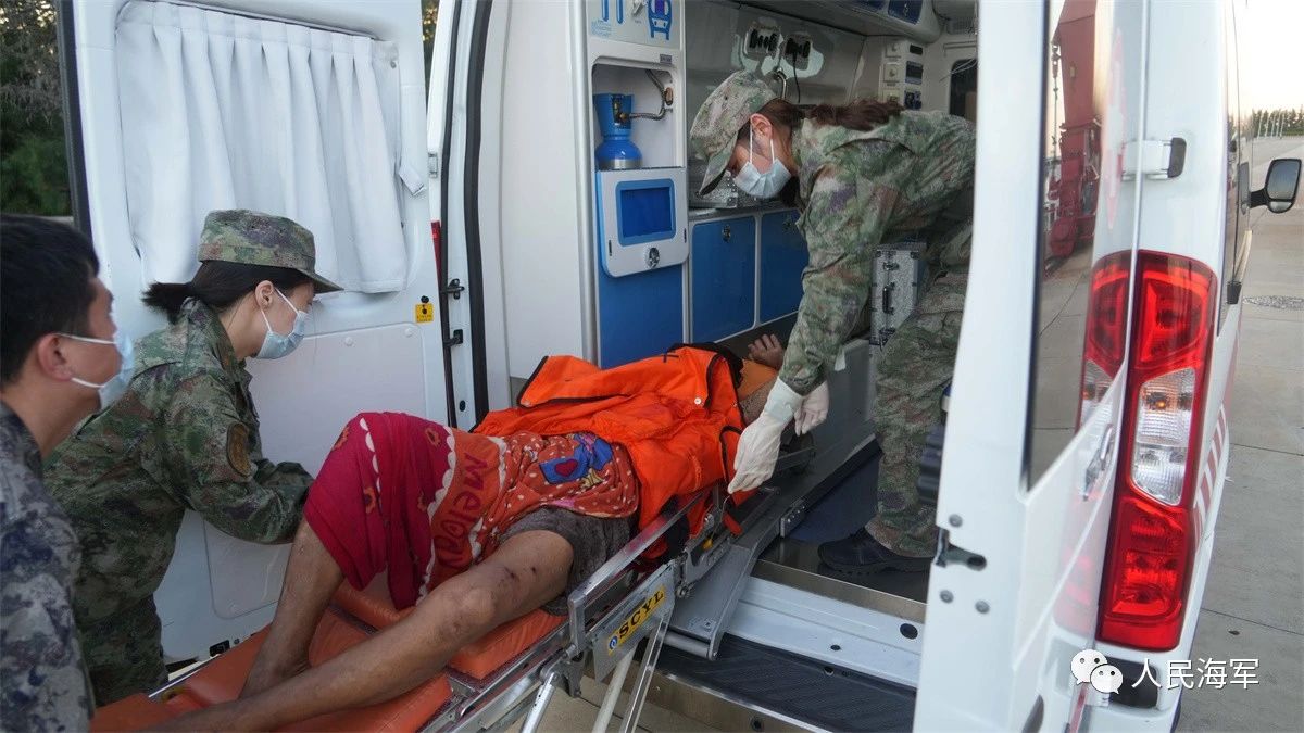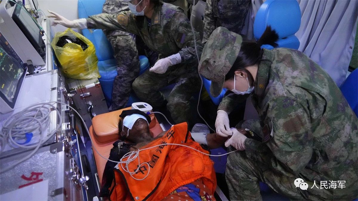 △医护人员在救护车内对越南受伤渔民进行紧急救治