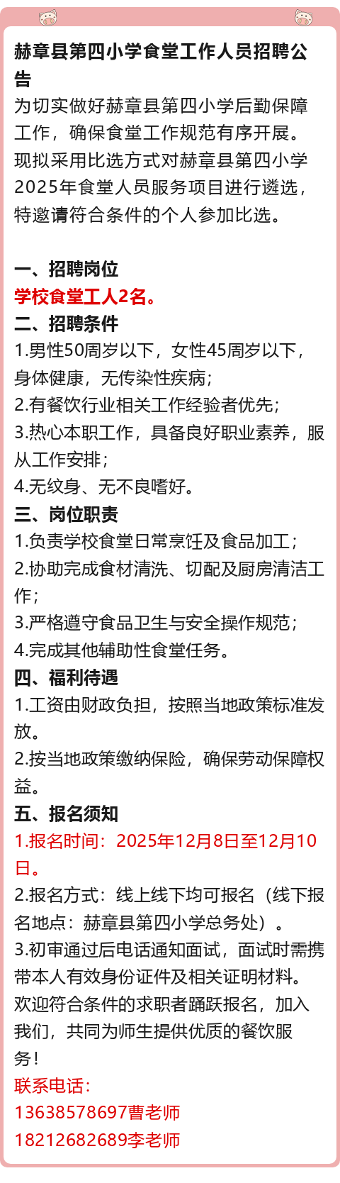 招聘学校食堂工人!男性50周岁以下,女性45周岁以下可报!