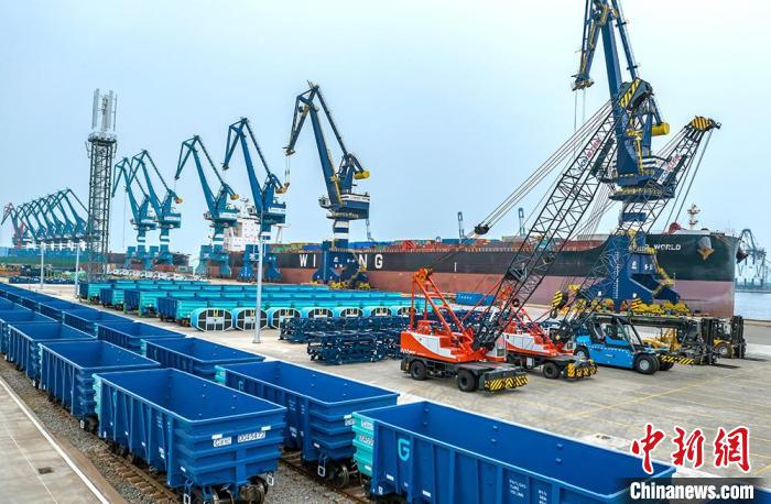 记者8日从山东港口烟台港获悉,60台“中国造”敞车车厢近日通过铁路运输抵达烟台港,在港口直接下线、拆解、装船,沿着“中非双向物流通道”发往非洲几内亚。