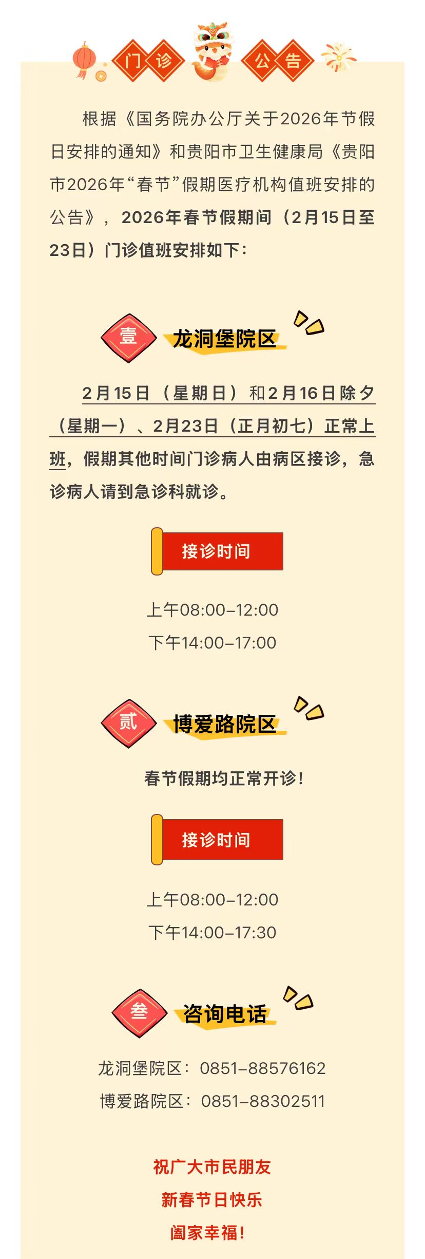 贵阳市第一人民医院2026年“春节”期间门诊应诊公告