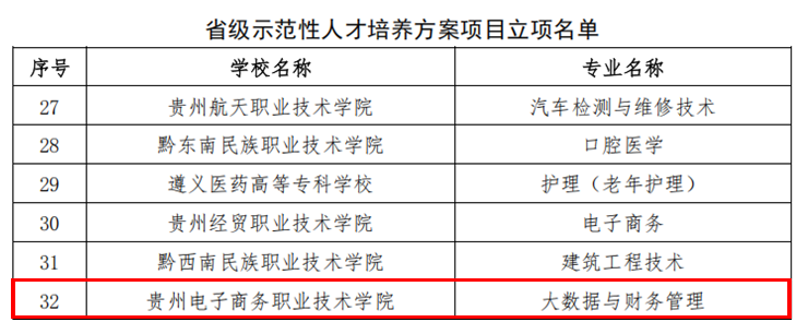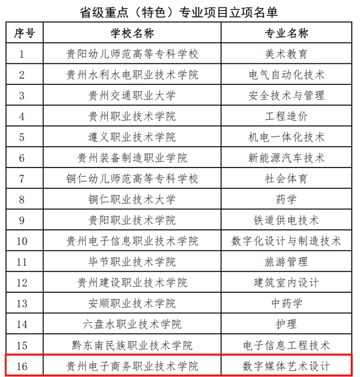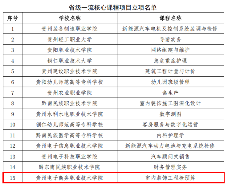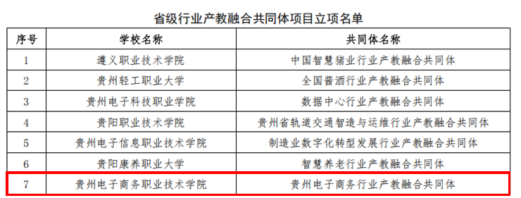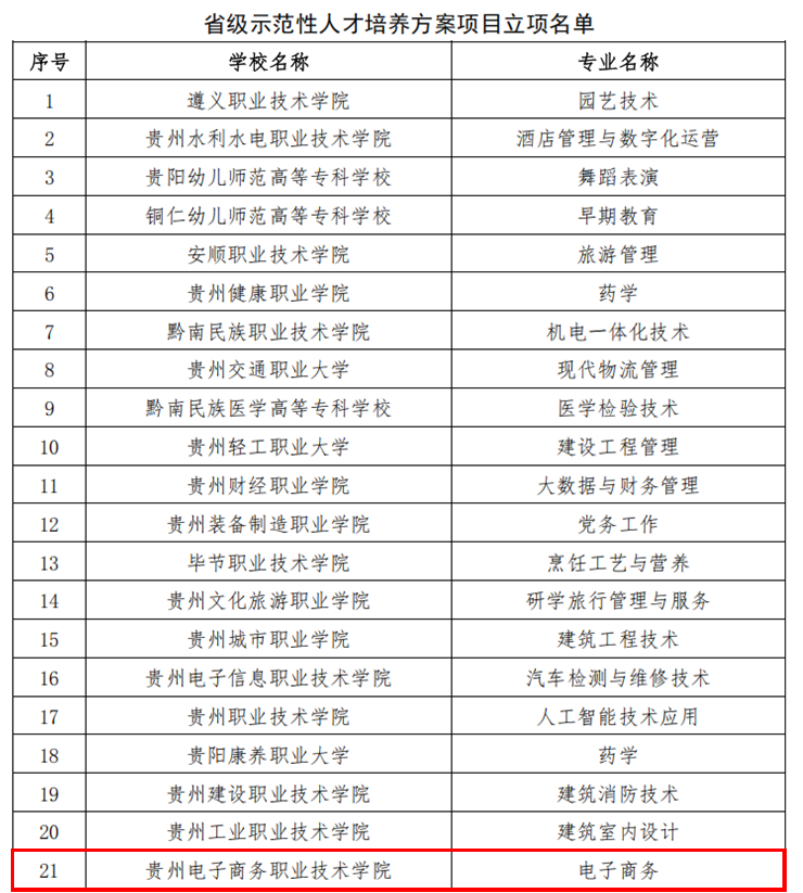 近日,2025年下半年贵州省职业教育“技能贵州”行动计划项目评审结果正式公布,贵州电子商务职业技术学院申报的信息化标杆学校、贵州电子商务行业产教融合共同体、室内装饰工程概预算一流核心课程、数字媒体艺术设计重点专业、电子商务专业和大数据与财务管理专业示范性人才培养方案6个项目获得立项。
