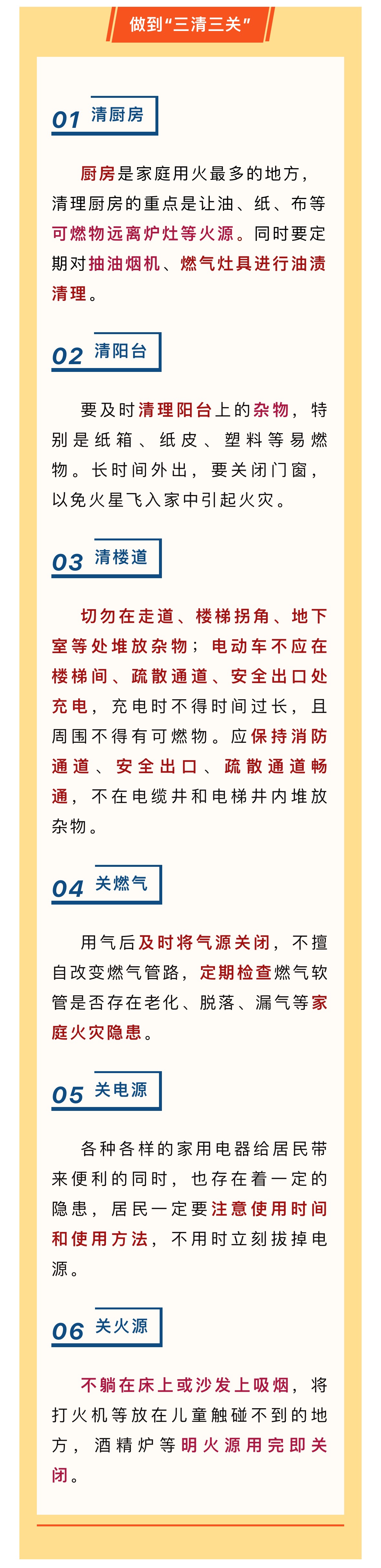 日常生活中,应注意用火用电安全,做到不私拉乱接电线,教育孩子不玩火,定期清理阳台、厨房等重点部位,从源头上消除安全隐患。