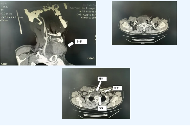 患者为中年男性,因“甲状腺右侧叶肿物切除术后复发1+年”入院。查体及影像学检查提示:甲状腺右叶区存在巨大(约8*9cm)、质硬、固定且边界不清的包块。经穿刺活检,病理确诊为“甲状腺乳头状癌并右颈淋巴结转移”。更为棘手的是,进一步评估发现,肿瘤范围广泛,已向下侵犯至胸腔入口,并与纵隔内重要血管结构关系密切、部分包绕,解剖层次紊乱。