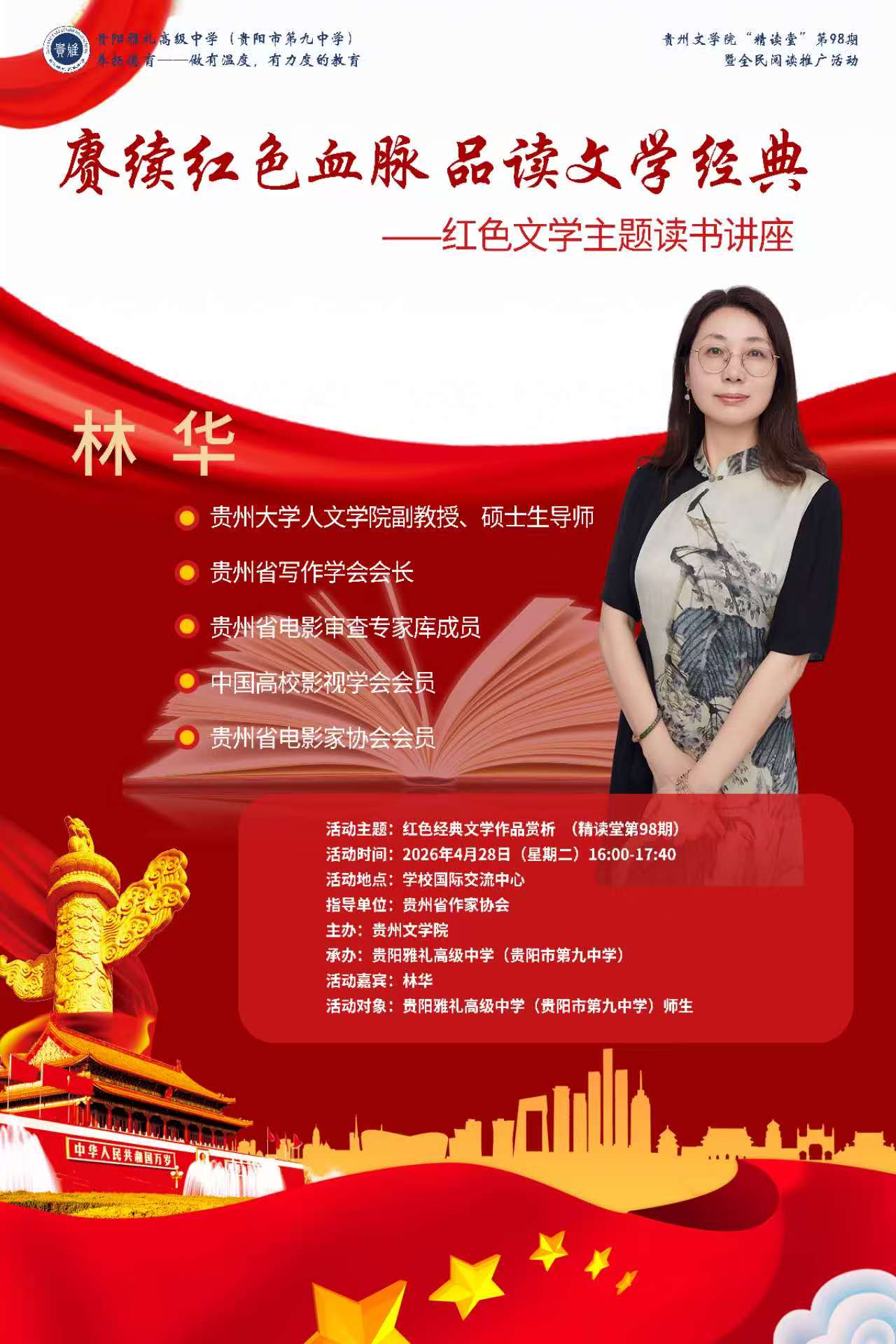 林华,贵州大学人文学院副教授,硕士生导师,贵州省写作学会会长、贵州省电影审查专家库成员、中国高校影视学会会员、贵州省电影家协会会员。主要从事写作教学和传统文化、影视美学研究工作。主讲课程:为本科生开设基础写作、应用写作、公文写作、中国现代文学经典精读、影视文学、影视艺术鉴赏等课程;为研究生开设电影文学研究、影视文化与传播等课程。