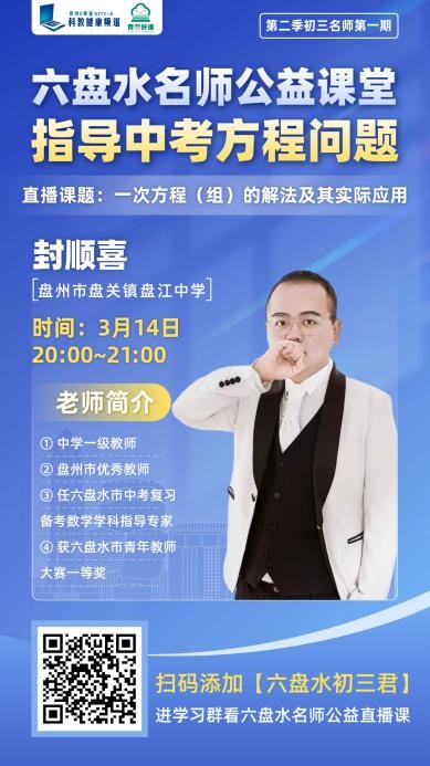 为深入贯彻落实教育惠民政策,切实解决初三学子备考中的实际困惑,由贵州广播电视台教育事业部与六盘水市教育局联合主办、六盘水市各初级中学深度参与的第二季《青云好课・六盘水名师公益直播课堂》(第二季)第二期将于本周五、周六正式开播。这是专为初三学子定制的全免费、高含金量中考冲刺公益课,贵州广播电视台以 “青云” 为名,打造名师公益直播课。依托全省顶尖名师资源,把优质课堂搬上 “云端”,跨越山川惠及更多学子。以名师引路、课程为阶,助学子拾级而上,触摸属于自己的“青云之志”。“青云好课”愿做托举之风,助力每个孩子的梦想都如“青云”般“云程发轫,万里可期”。