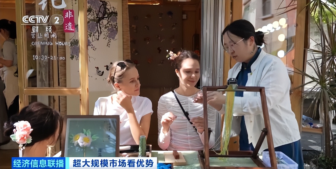在深圳南头古城,来自俄罗斯的大学生爱丽丝和宝琳正在一家非遗工作室里体验制作绒花发簪,只见蚕丝在她们指尖缠绕、捻转,渐渐绽放出一朵粉红色的木棉花。