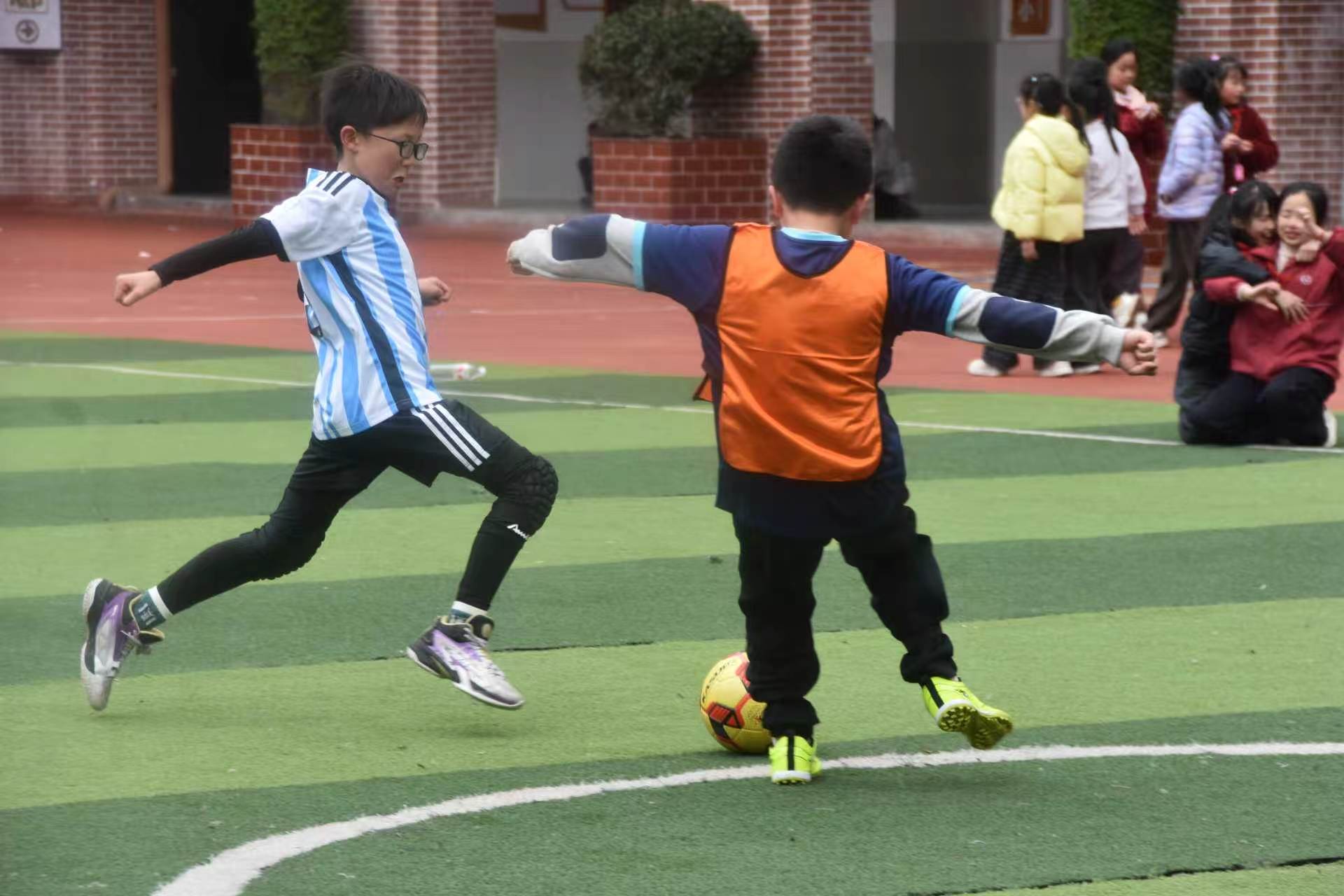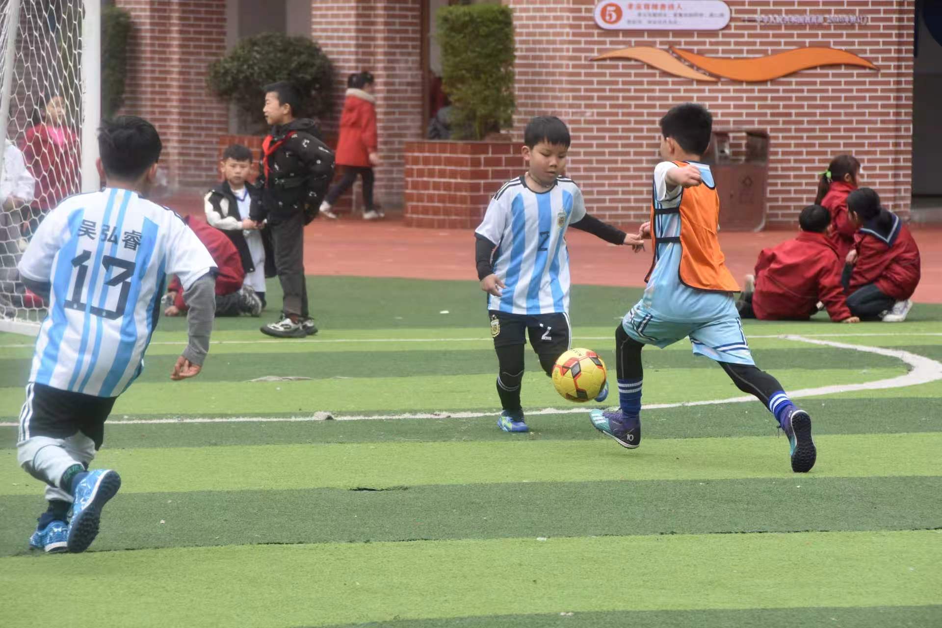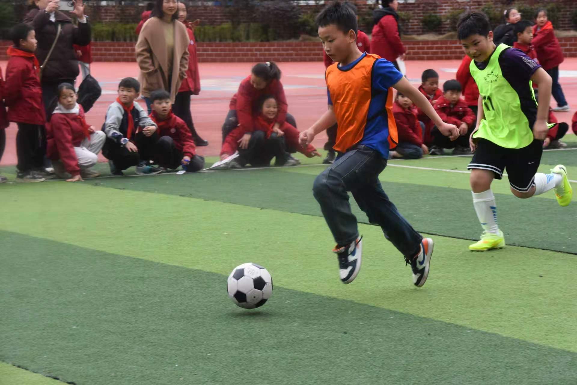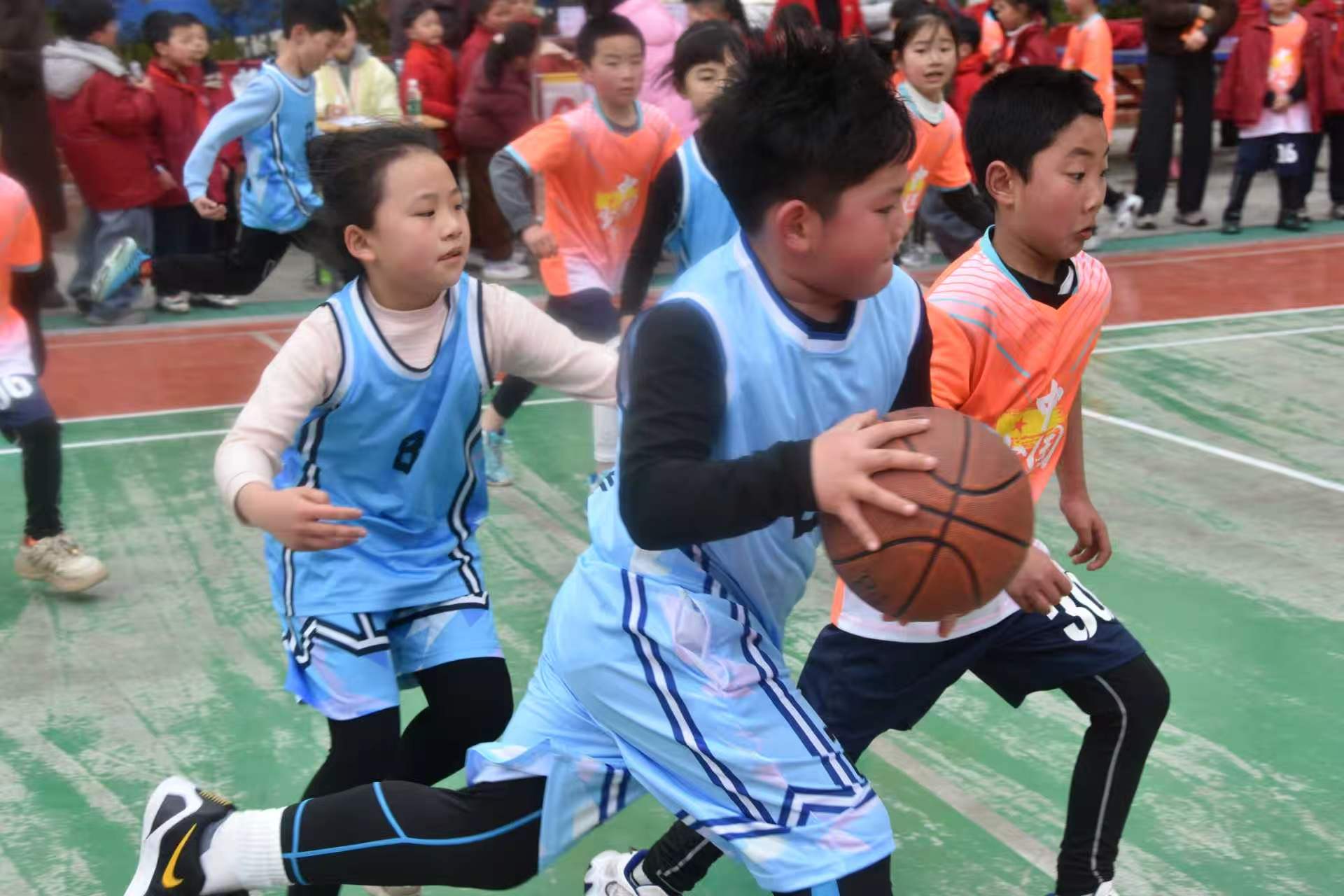 随着裁判哨声响起,比赛正式打响:绿茵场上,足球小将们带球突破、默契传球、精准射门,每一次进攻都牵动着观众的心;篮球场上,小球员们运球、传球、上篮,配合流畅,攻防转换间尽显青春活力。场边的老师、家长和同学们呐喊助威,掌声、欢呼声此起彼伏,校园里洋溢着热烈的运动氛围。