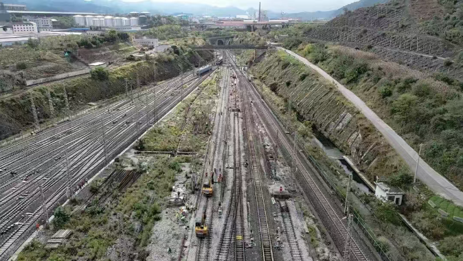 “本次改造工程将分阶段推进,第一阶段重点实施线路破底清筛、换轨换枕、路基开挖平整等配套工程,同步对站场内待3线、牵1线、1047# 岔后及1079-1083# 岔间渡线等关键区段进行设备更新。施工中采用“人工+大型机械”协同作业模式,投入挖掘机、门式起道机、小型液压捣固机等60余台(套)专业设备,严格遵循Ⅲ级施工标准,单次封锁施工时间控制在300分钟内,确保施工与铁路运输高效衔接、互不干扰。”贵阳工务段施工负责人黄霖介绍道。