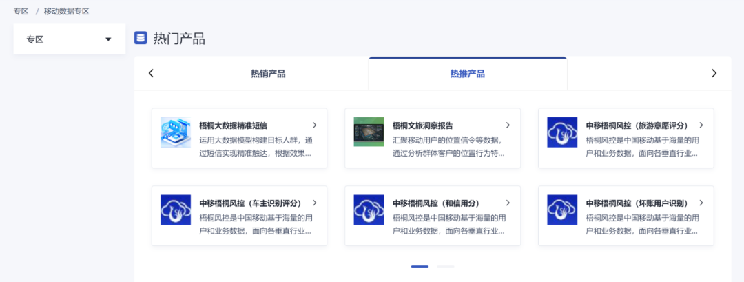 “移动数据专区”基于中国移动海量数据资源和平台丰富的大数据组件工具集,可支撑大数据与政府、金融、旅游、交通等多个领域的融合场景,具备客户覆盖广、使用频次高、场景关联性强等特点。目前专区首批挂牌上市数据产品超百个,均为中国移动旗下“梧桐大数据”产品品牌,围绕风控大数据、洞察大数据、触达大数据、咨询服务及大数据工具五大产品线,打造系列优质大数据产品及解决方案,推动千行百业“用数赋智”。
