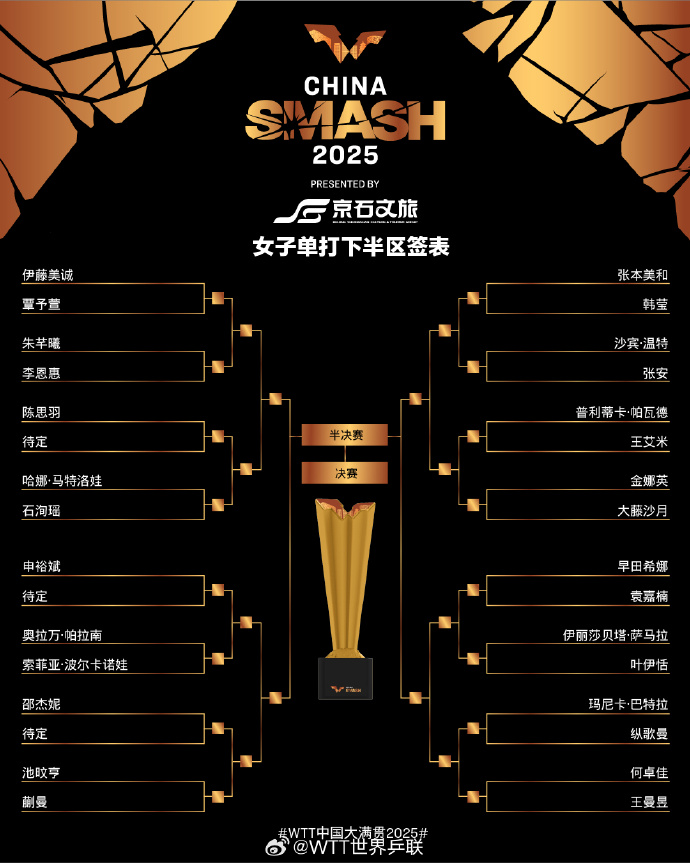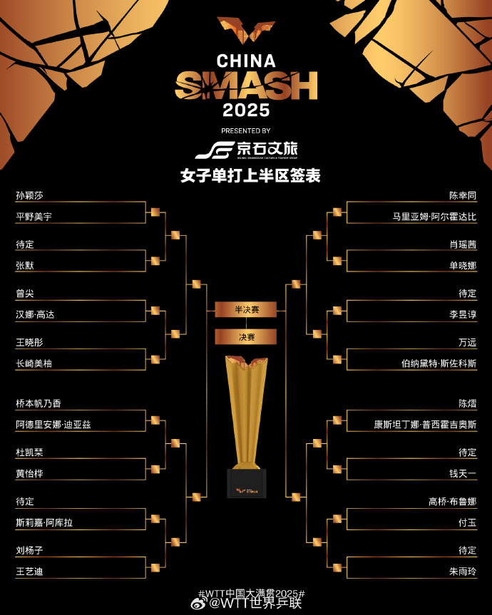女单方面,中国队孙颖莎、王曼昱、陈幸同、蒯曼、王艺迪、陈熠、石洵瑶、钱天一、何卓佳、王晓彤、覃予萱、纵歌曼12人直接参与正赛角逐。女队签表相对均衡,上下半区各6人。孙颖莎、王艺迪、王晓彤、陈幸同、陈熠、钱天一身处上半区,王曼昱、蒯曼、石洵瑶、何卓佳、覃予萱、纵歌曼镇守下半区。1/4区,孙颖莎将率先对阵日本选手平野美宇,王艺迪对阵澳大利亚选手刘杨子,王晓彤将迎战日本选手长崎美柚。2/4区,陈幸同的对手将是选手埃及选手阿尔霍达比,陈熠将率先对阵澳大利亚选手普西霍吉奥斯,钱天一的对手将是一位从资格赛突围的选手。3/4区,覃予萱、石洵瑶、蒯曼的首轮对手分别是日本选手伊藤美诚、捷克选手马特洛娃、澳大利亚选手池旼亨。4/4区,王曼昱与何卓佳将率先展开“内战”,纵歌曼将迎战印度选手巴特拉。(图片来源:WTT世界乒联微博)
