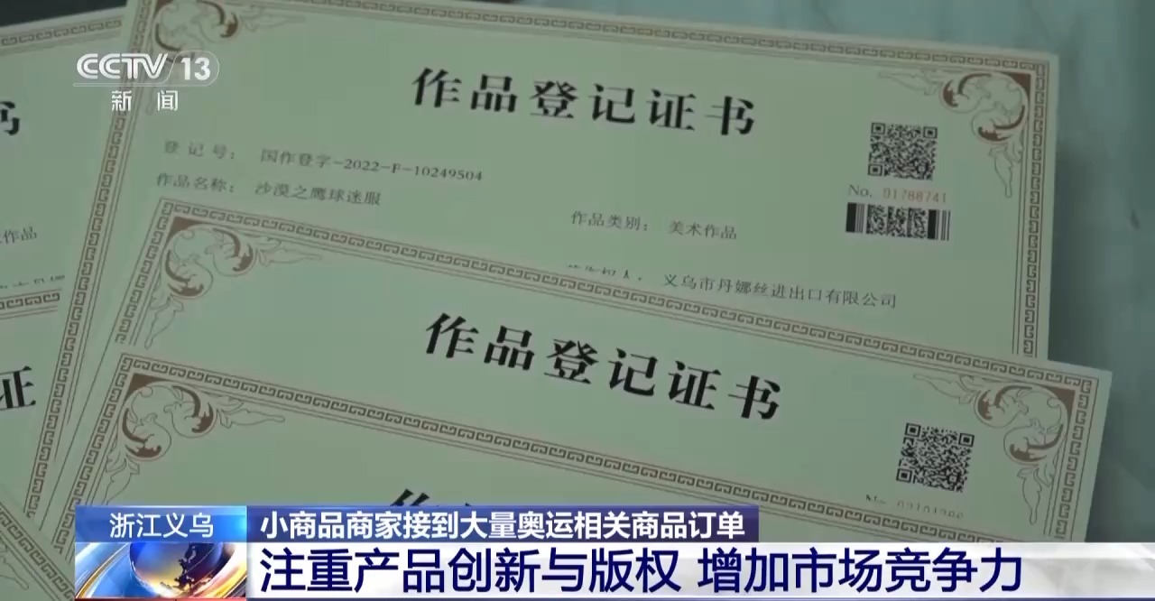 浙江义乌国际商贸城经营户 温从见:我们原创的球衣真正得到认可的时候应该是在卡塔尔世界杯上,那个时候我们设计生产了32款世界杯的原创球衣,经推出之后,非常受消费者的青睐,那个时候我们的销量接近有200万件。在原创球衣热销的同时,我们也发现了一个问题,我们卖得好的时候,市场上就有很多人模仿我们这个款式在做,虽然我们后来加急申请了版权,但是等版权证书下来之后,世界杯已经结束了。通过这个事情,一方面我们尝到了原创球衣给我们带来的甜头,另外一方面我也意识到了版权保护的重要性。