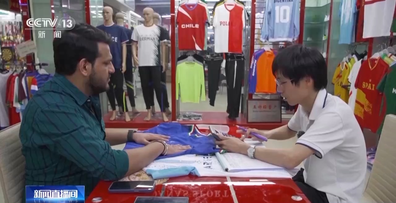 浙江义乌国际商贸城经营户 温从见:这些是我们为欧洲杯、美洲杯以及将要到来的巴黎奥运会设计的最新款球衣,这个法国、德国球衣都是我们最近刚出的新款。