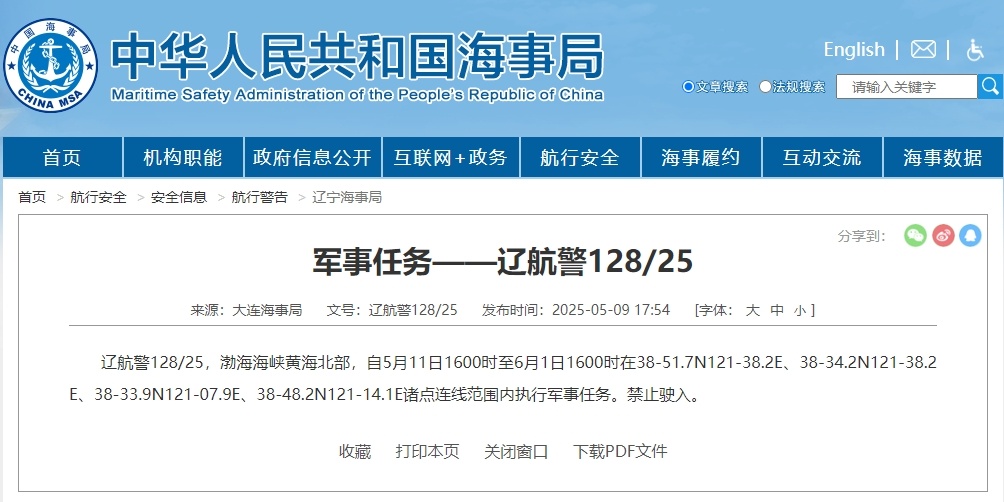 据中国海事局网站消息,大连海事局发布航行警告,5月11日16时至6月1日16时,渤海海峡黄海北部部分海域执行军事任务,禁止驶入。