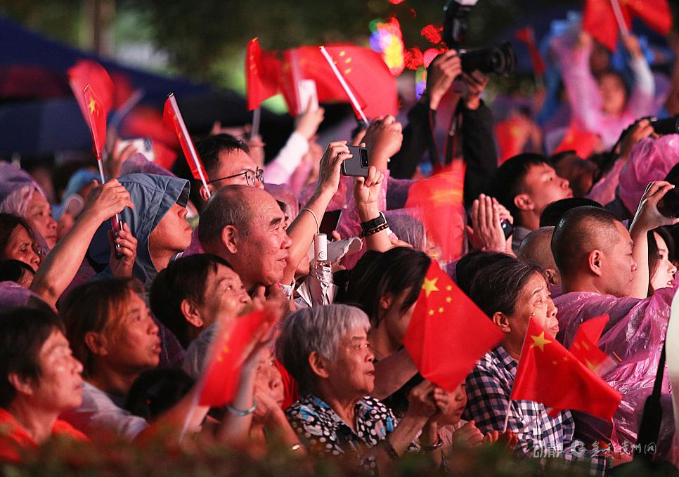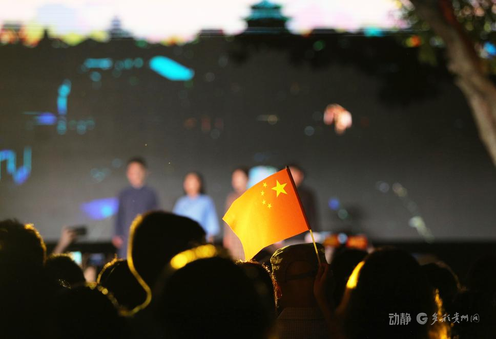 台下,观众们挥动国旗;台上,人影朦胧,仿佛历史与当下在这一刻重逢