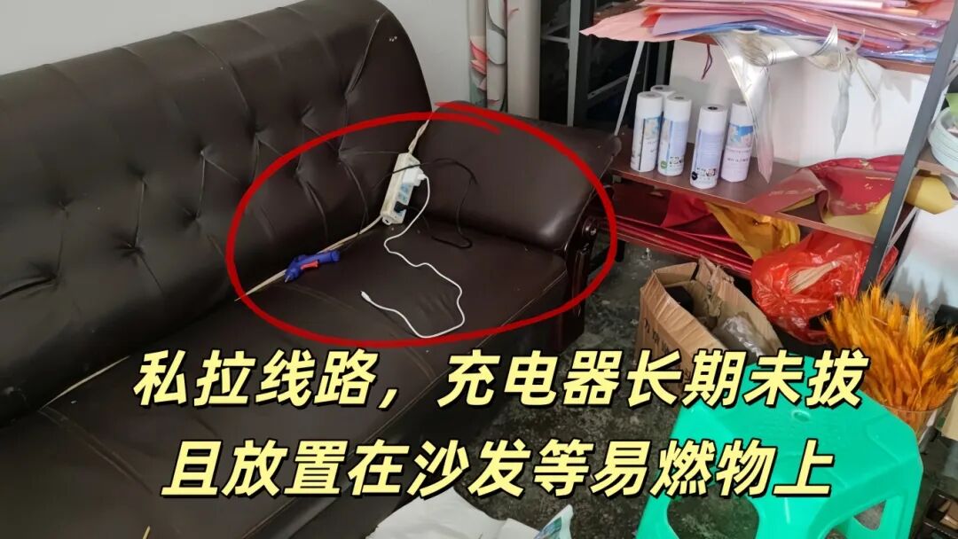 火灾隐患:私拉线路,充电器长期未拔且放置在沙发等易燃物上。