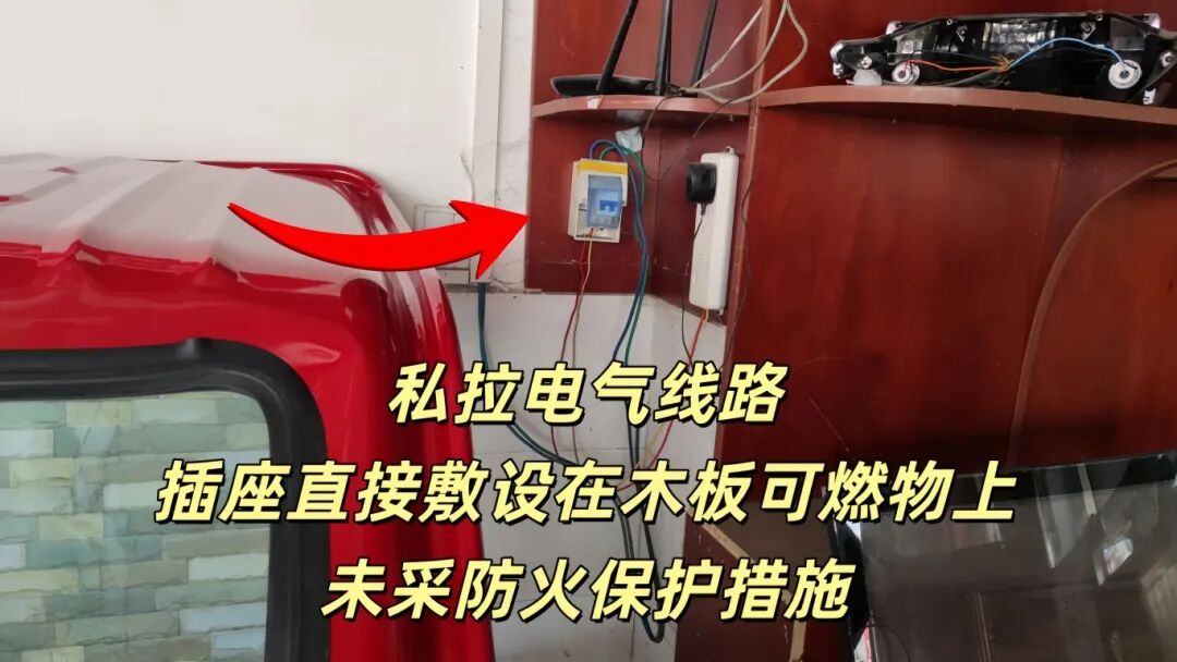 火灾隐患和违法行为:存在私拉电气线路,插座直接敷设在木板可燃物上,未采防火保护措施的火灾隐患。存在在室内对电动自行车蓄电池进行充电的违法行为。