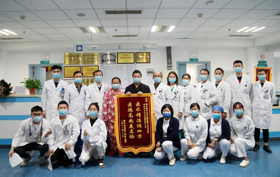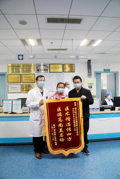 上午9点多,在遵义医科大学附属医院的病房,记者见到了47 岁的邹女士,她与丈夫陈先生为医生团队准备了一面锦旗,感谢医护人员这一个月对自己的照顾。