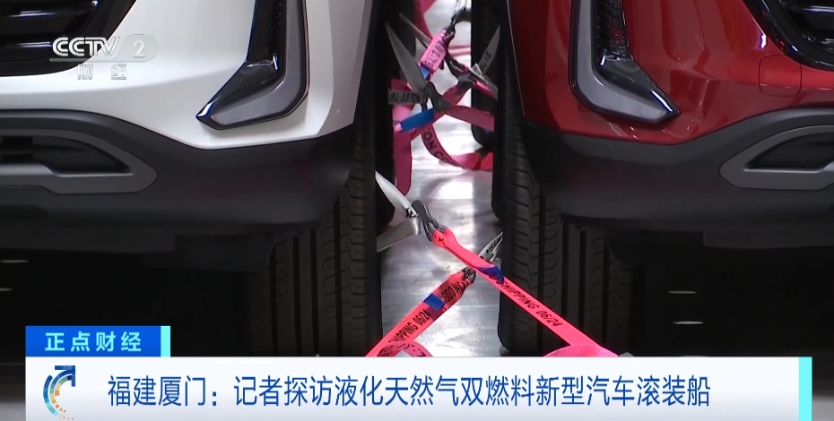 在厦门远海码头,记者身后7500车位的国产LNG双燃料滚装船,待将国产汽车装运上船之后将实现首航,下一步将驶往上海再进行一次装载,总共装载15个品牌5171辆车发往欧洲。