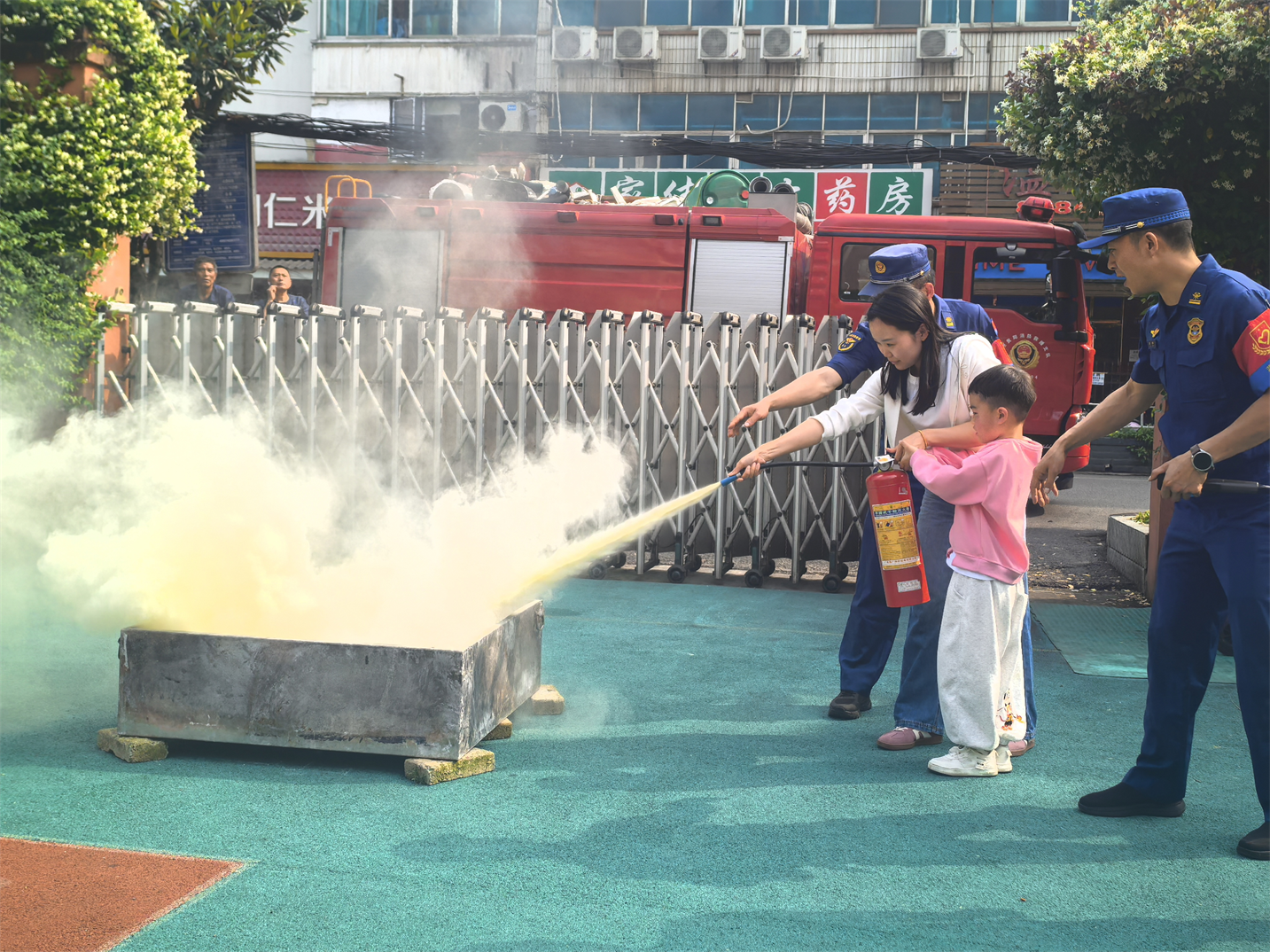 针对幼儿认知特点,宣传人员以通俗语言详细讲解各类消防装备器材的适用场景与操作规范,现场展示灭火战斗服、灭火器、消防水带等设备,并组织消防志愿者身着战斗服进行零距离演示,引导幼儿沉浸式体验消防器材使用流程。在实操环节,教师和幼儿有序参与灭火器模拟灭火演练,通过 “理论讲解——示范操作——实践体验” 闭环教学,切实提升消防技能掌握度。