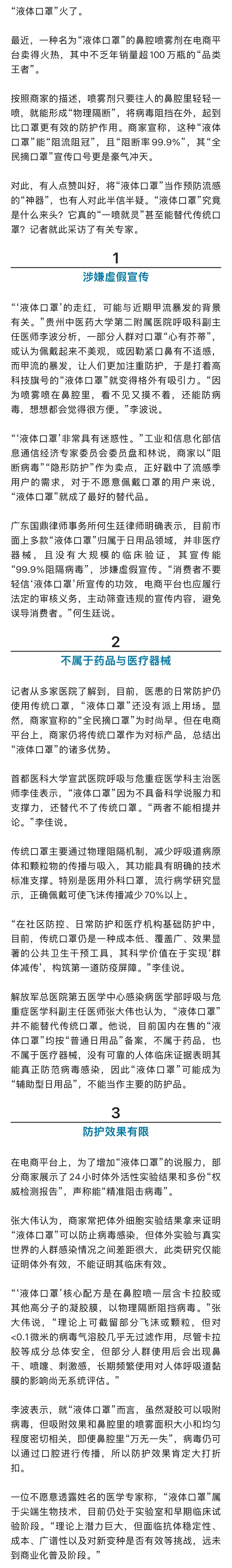 “预防流感神器”液体口罩走红!能替代传统口罩吗?专家释疑→